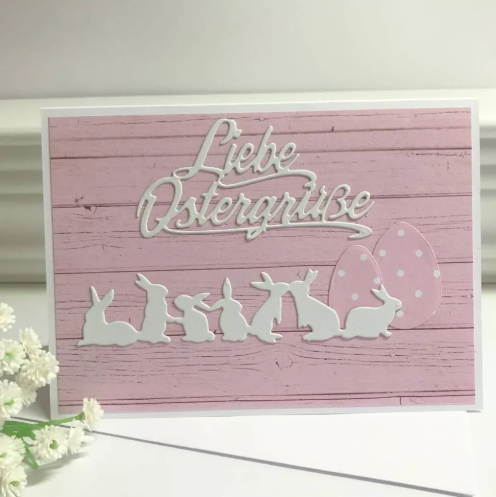 Von Hand gestanzte Teile: Schriftzug „Liebe Ostergrüße“, gepunktete Ostereier und eine weiße Hasenbande
