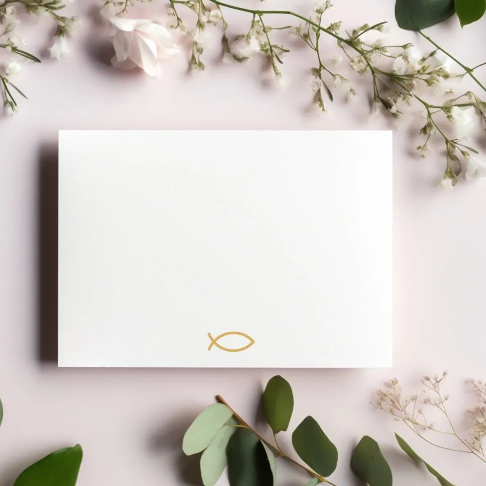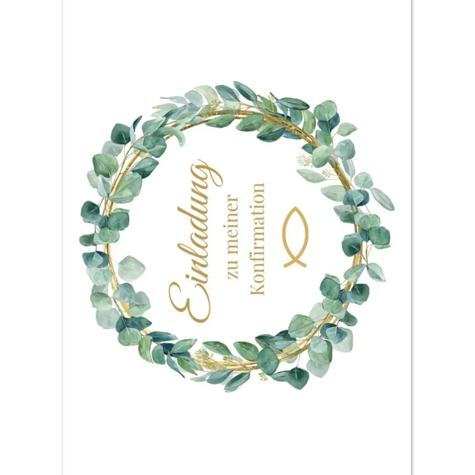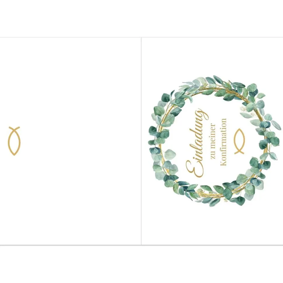 Im Mittelpunkt der Vorderseite steht ein detailreicher Kranz aus grünen Blättern, der für eine frische, harmonische Ausstrahlung sorgt. In der Mitte befindet sich der klar gesetzte Schriftzug „Einladung zu meiner Konfirmation“, der den Anlass direkt und ansprechend kommuniziert. Unterhalb des Textes findet sich ein goldfarbener Fisch, das klassische Symbol des christlichen Glaubens. Auch auf der Rückseite der Einladung zur Konfirmation ist dieses Symbol erneut abgebildet und verleiht dem Design eine stimmige, durchdachte Struktur.
