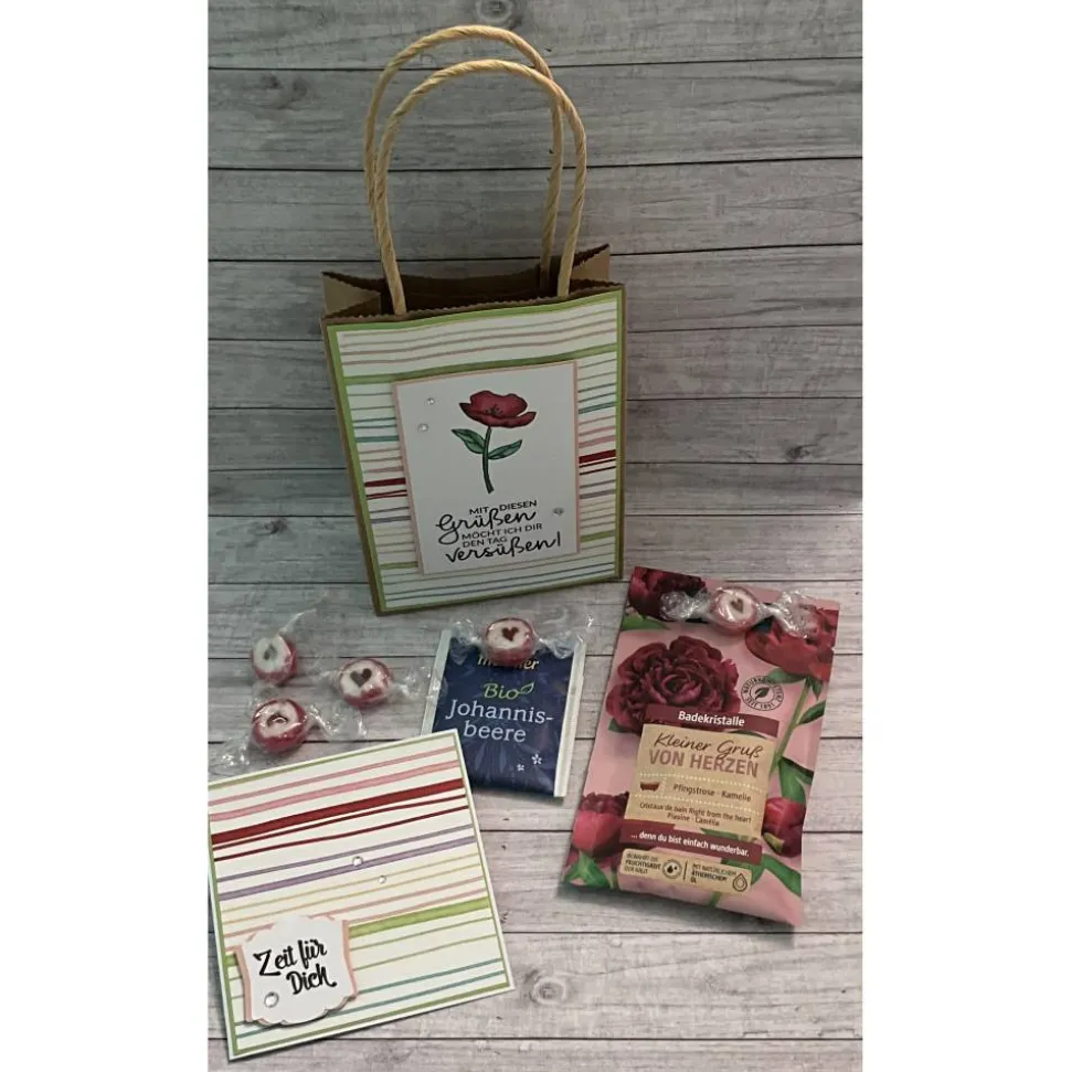 Dann biete ich dir hier dieses Geschenkset. Eine Verpackung in Form einer Tüte, die gefüllt ist mit Kleinigkeiten, für eine „kleine Auszeit“. Außerdem ist eine kleine Grußkarte mit dabei, damit noch ein paar Zeilen nieder geschrieben werden können.