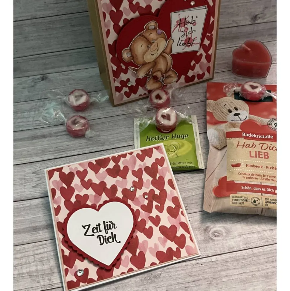 Dann biete ich dir hier dieses Geschenkset. Eine Verpackung in Form einer Tüte, die gefüllt ist mit Kleinigkeiten, für eine „kleine Auszeit“. Außerdem ist eine kleine Grußkarte mit dabei, damit noch ein paar Zeilen nieder geschrieben werden können.
