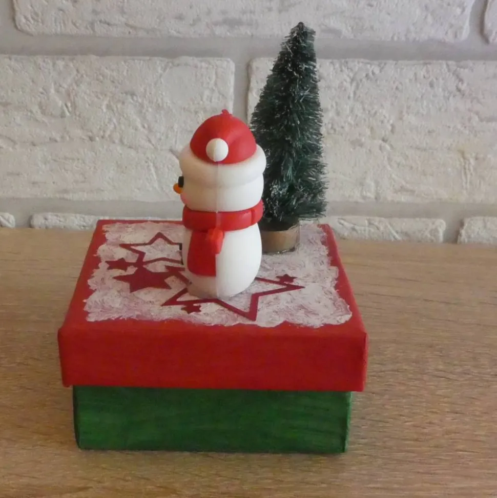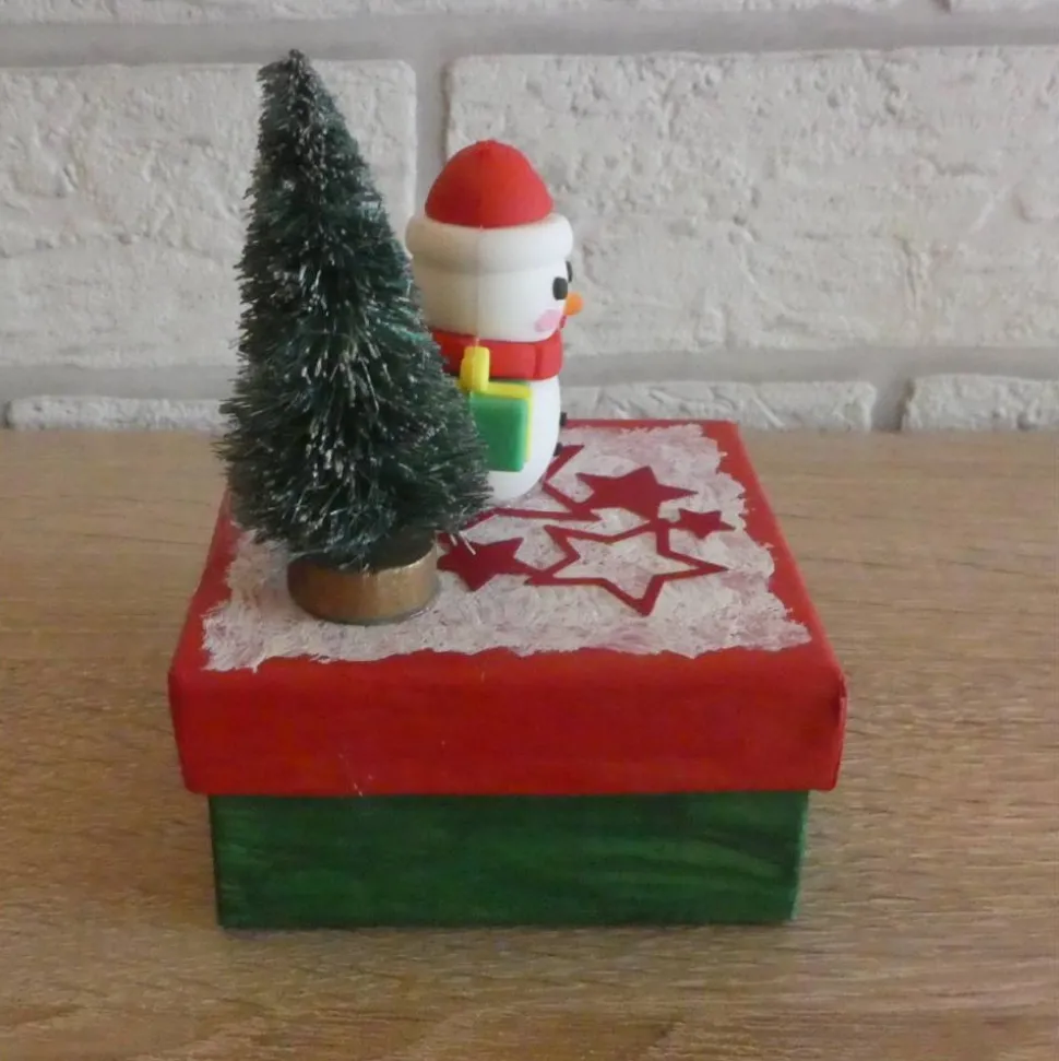 Die Geschenkverpackung besteht aus einer bemalten und verzierten Pappschadchtel mit Schneemann und Tannenbaum.