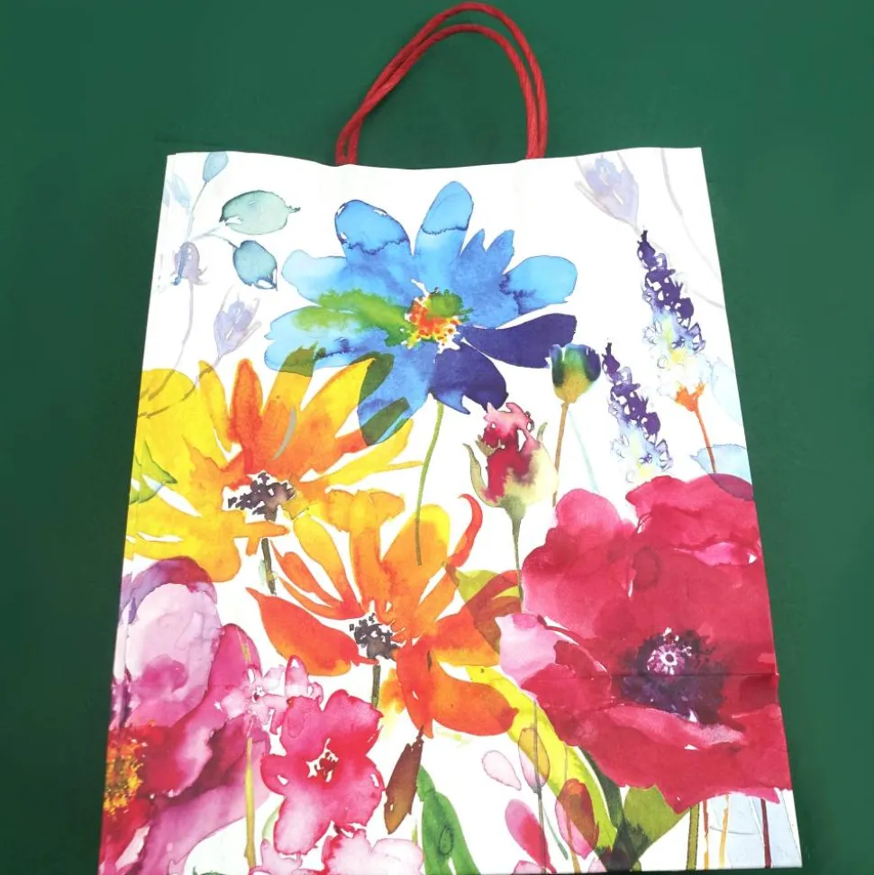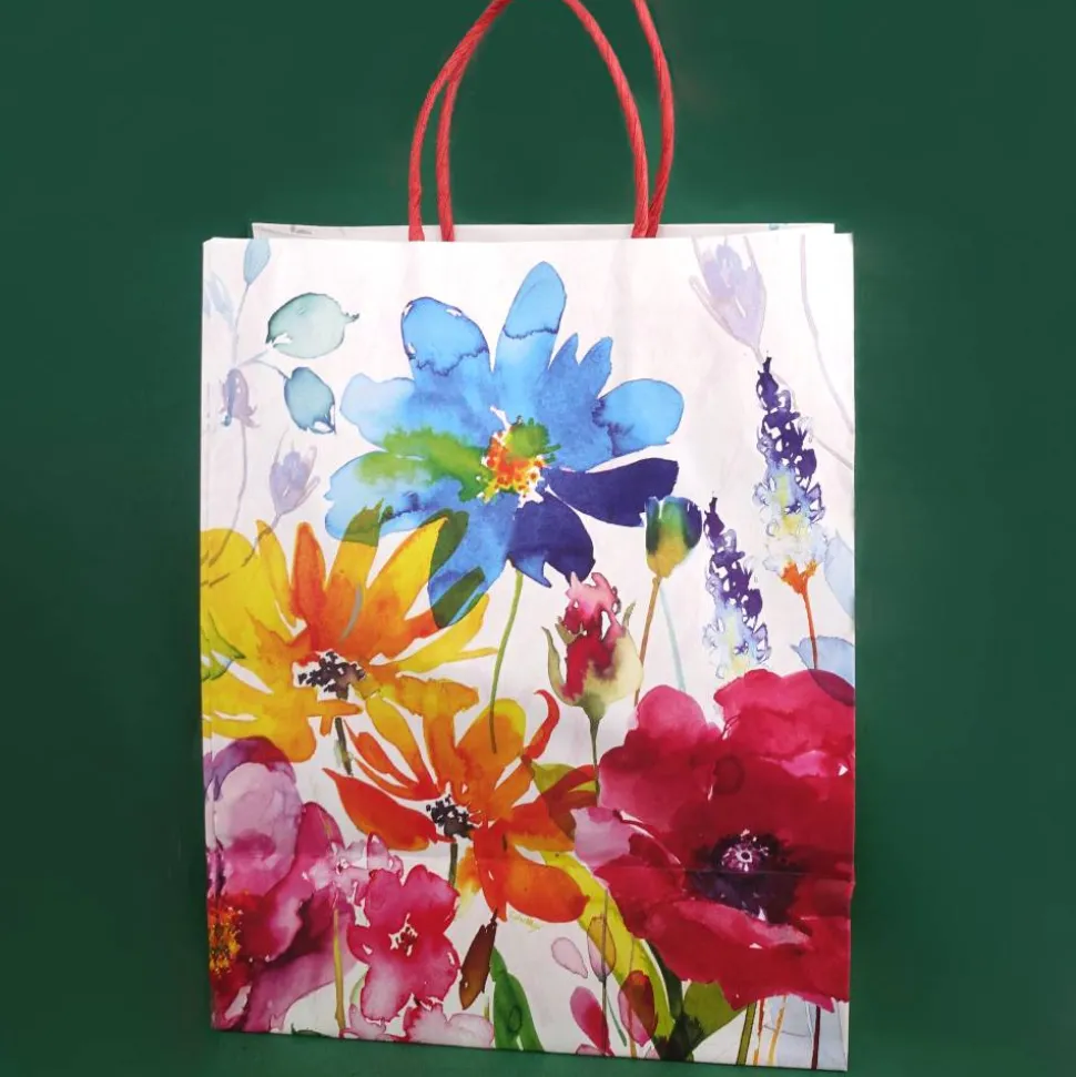 Die kleine Tragetasche ist mit kräftig bunten Aquarell Blumen geschmückt. Die Griffe sind rote Kordeln aus gedrehtem Papier.