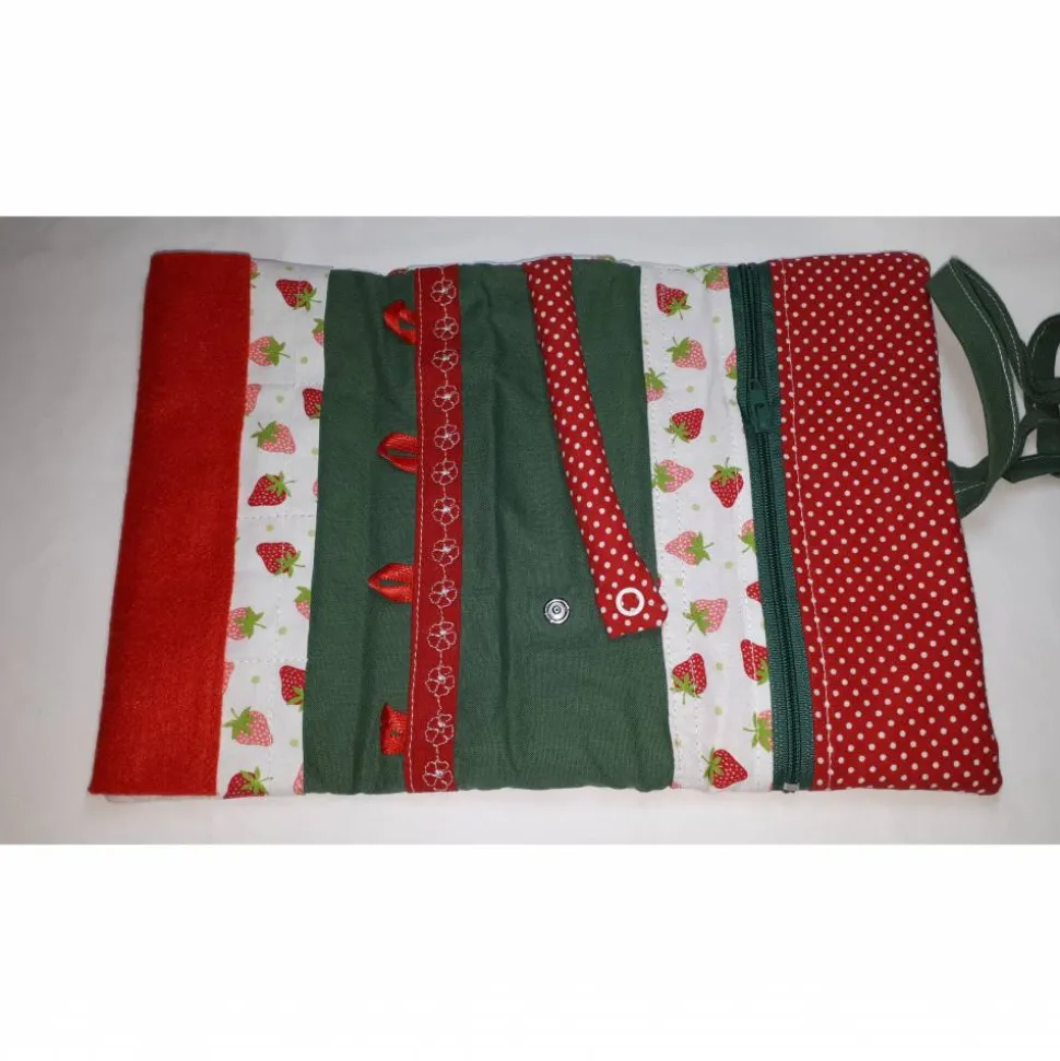 weiß mit kleinen Erdbeeren, innen kombiniert mit einem dunkleren grün und rot mit weißen Pünktchen.