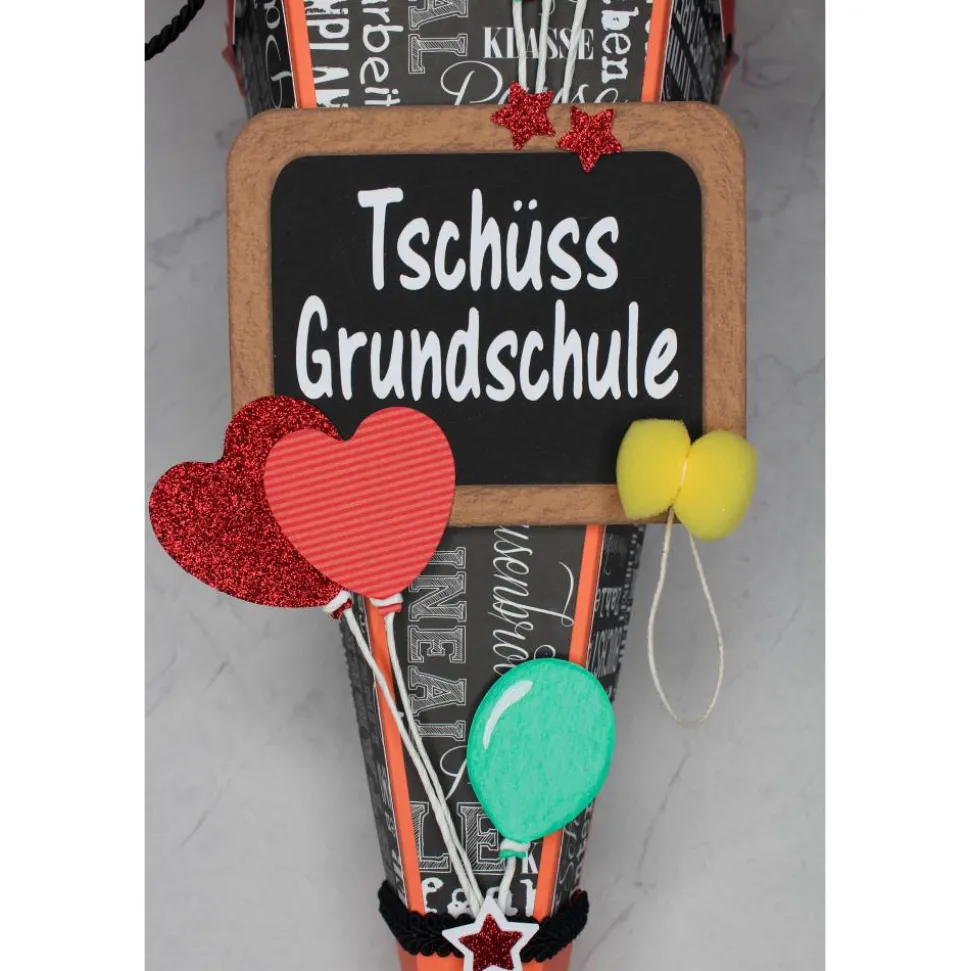 Die Schultafel mit dem Text „Tschüss Grundschule“ bildet das Hauptmotiv und ist mit einem kleinen Schwämmchen verziert. Je nach Modell ist die Tafel in schwarz oder grün gefertigt.