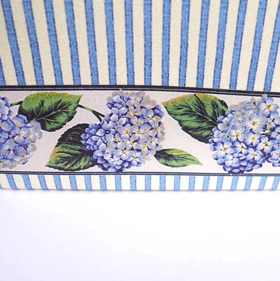 Die kleine „Tasche“ hat blau-weiße Streifen und eine Bordüre aus blauen Hortensien.