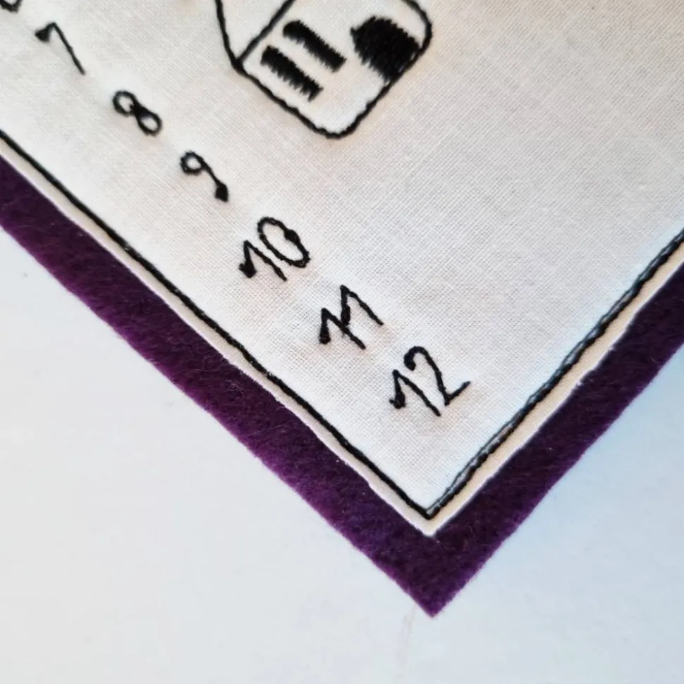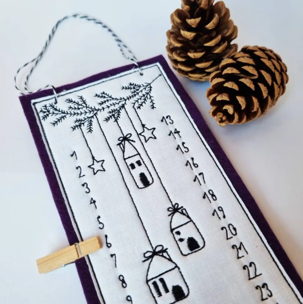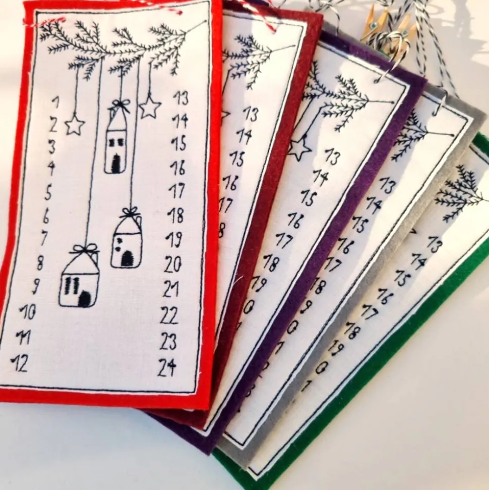 Der Kalender wird aus doppelten Filzplatten, einem Vintage-Baumwollstoff aus den 60er Jahren (Linon-Webart) sowie hochwertigem Stickgarn gefertigt. Die Maße von 19 x 10 cm und die 2 mm Dicke machen ihn kompakt und vielseitig platzierbar. Mit der robusten Baumwollkordel (ca. 60 cm, doppelt gelegt) kannst du ihn einfach aufhängen. Der Countdown bis Weihnachten wird mit einer rustikalen Holzklammer angezeigt und lässt sich jedes Jahr aufs Neue nutzen – für einen nachhaltigen Adventscountdown ohne Kalorien!