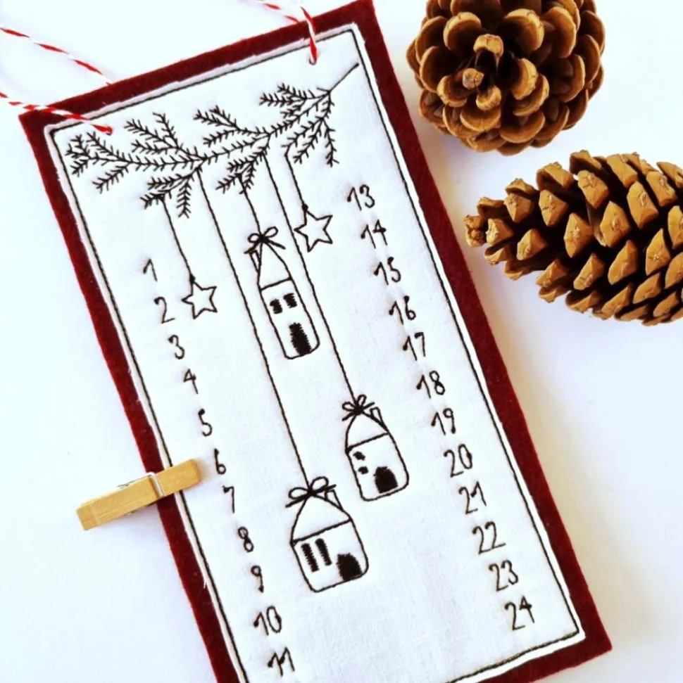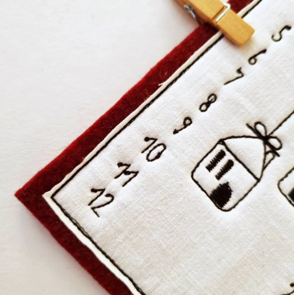 Der Kalender wird aus doppelten Filzplatten, einem Vintage-Baumwollstoff aus den 60er Jahren (Linon-Webart) sowie hochwertigem Stickgarn gefertigt. Die Maße von 19 x 10 cm und die 2 mm Dicke machen ihn kompakt und vielseitig platzierbar. Mit der robusten Baumwollkordel (ca. 60 cm, doppelt gelegt) kannst du ihn einfach aufhängen. Der Countdown bis Weihnachten wird mit einer rustikalen Holzklammer angezeigt und lässt sich jedes Jahr aufs Neue nutzen – für einen nachhaltigen Adventscountdown ohne Kalorien!