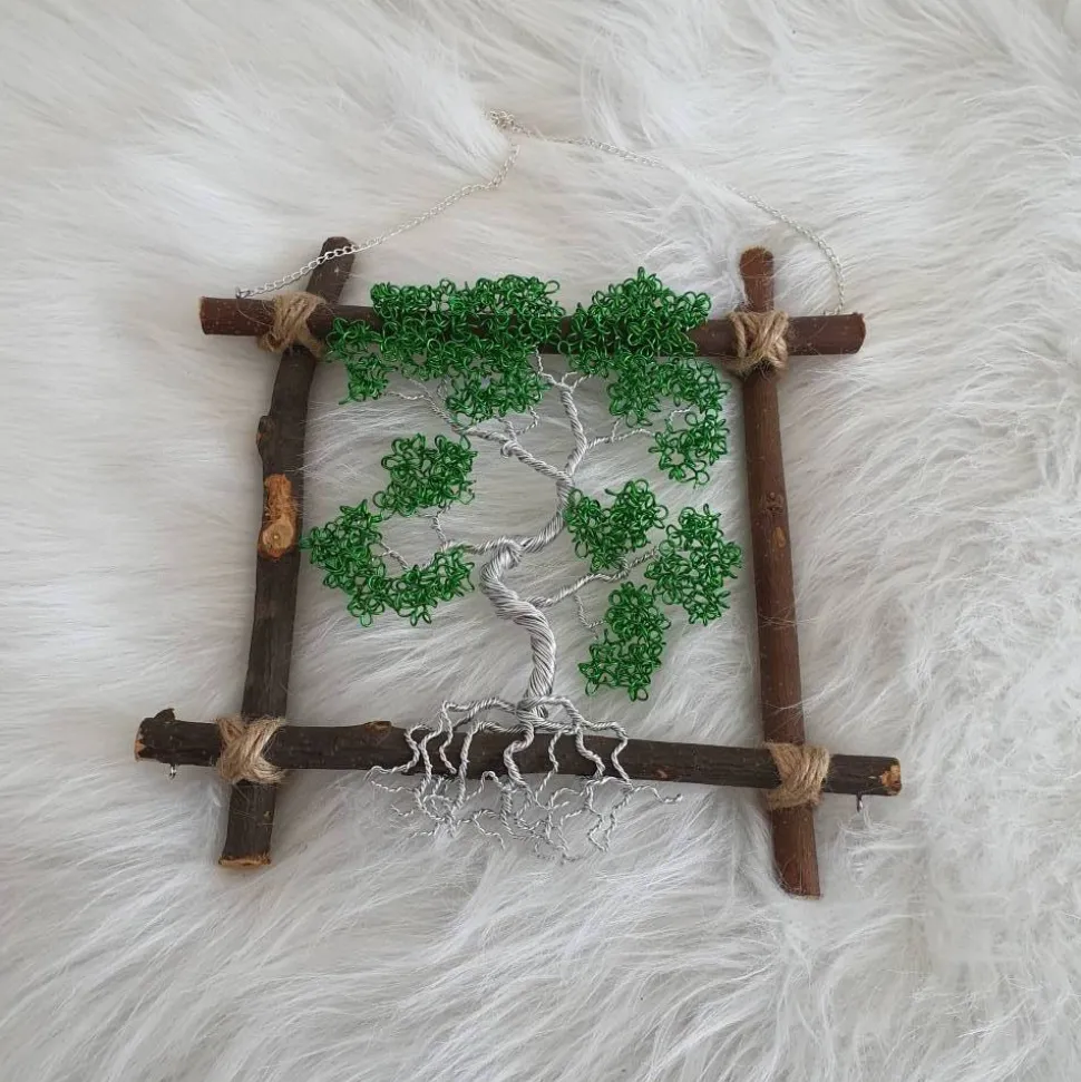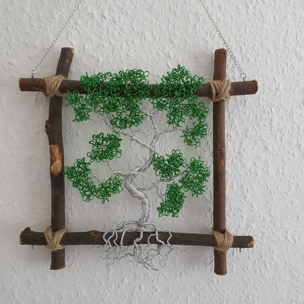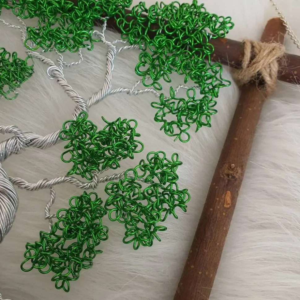 Der Drahtbaum selbst besteht aus Aluminiumdraht, ich verwende für den Baum über 25 Meter Draht. Der Rahmen besteht aus 4 Natur Ästen die durch eine Kordel verknotet werden. Als Aufhängung dient eine Eisenkette die silberfarben plattiert ist, die am oberen Ast befestigt ist. Diese Dient auch als Verbildung zum Ast mit dem Schriftzug. Der Schriftzug wird aus silberfarbenen Aluminiumdraht Handgebogen. Und wird mit sehr dünnen Draht auf dem Ast befestigt.