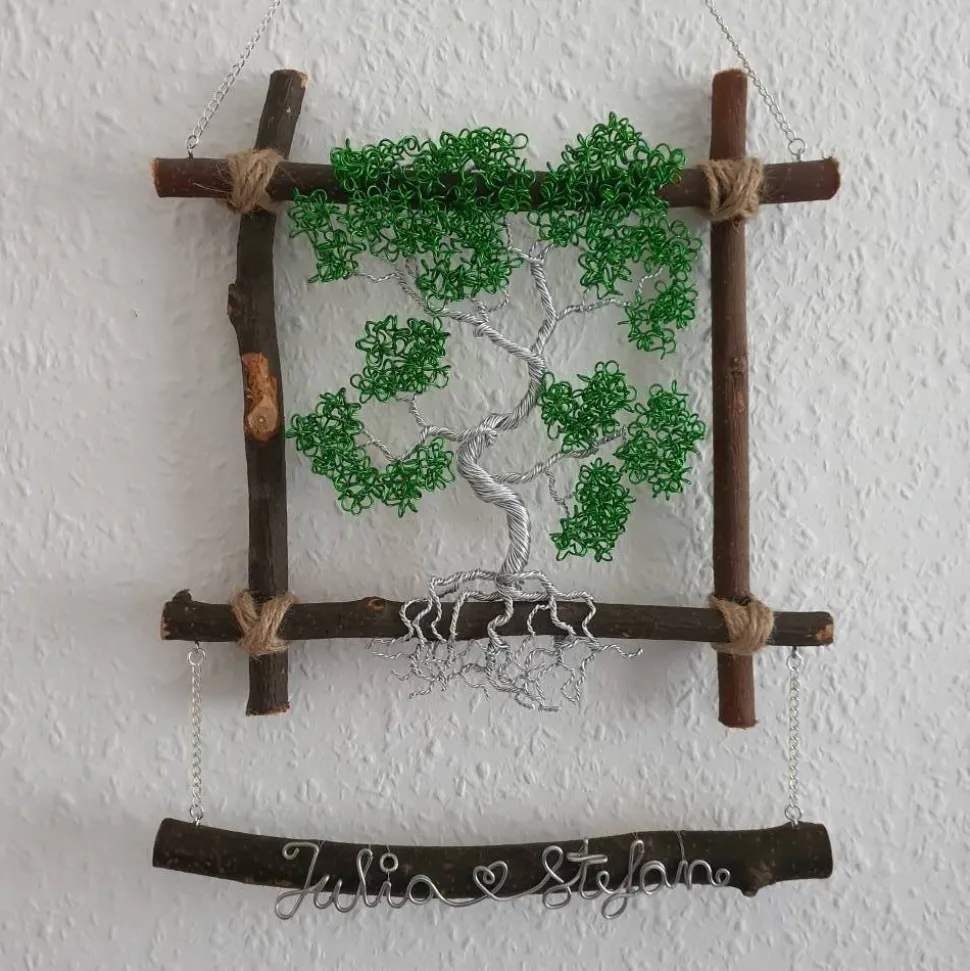 Der Schriftzug kann auch individuell angefertigt werden. Der Drahtbaum wurde nicht an die Äste geklebt, sondern wurde von mir mit dem Draht selbst an den Ästen befestigt.