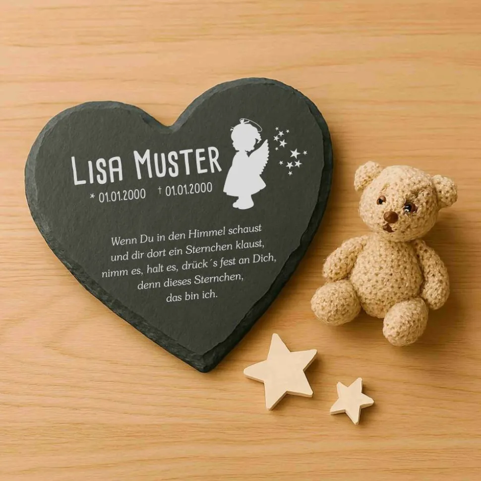 Persönliches Erinnerungsstück: Die langlebige Gravur macht die Schieferplatte zum idealen Grabstein oder Gedenkstein für dein Sternenkind. Deine Wünsche stehen bei uns im Mittelpunkt – wir setzen jeden Auftrag mit viel Herz und Sorgfalt um.