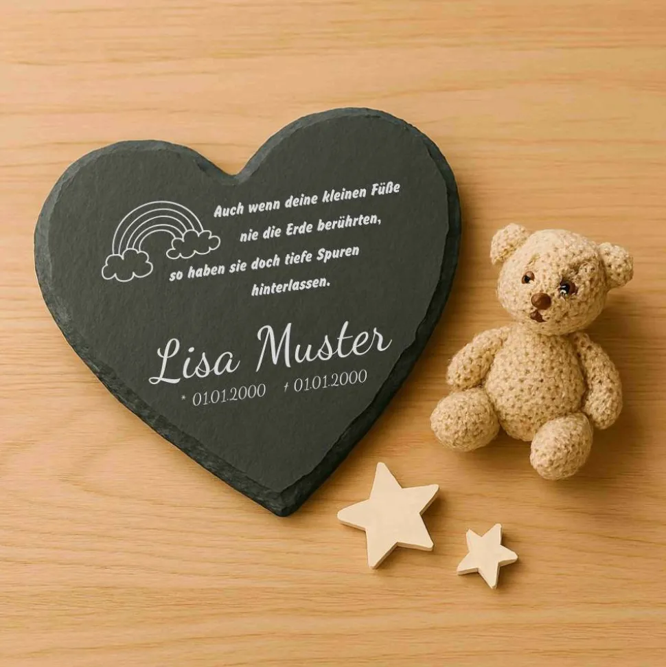 Persönliches Erinnerungsstück: Die langlebige Gravur macht die Schieferplatte zum idealen Grabstein oder Gedenkstein für dein Sternenkind. Deine Wünsche stehen bei uns im Mittelpunkt – wir setzen jeden Auftrag mit viel Herz und Sorgfalt um.