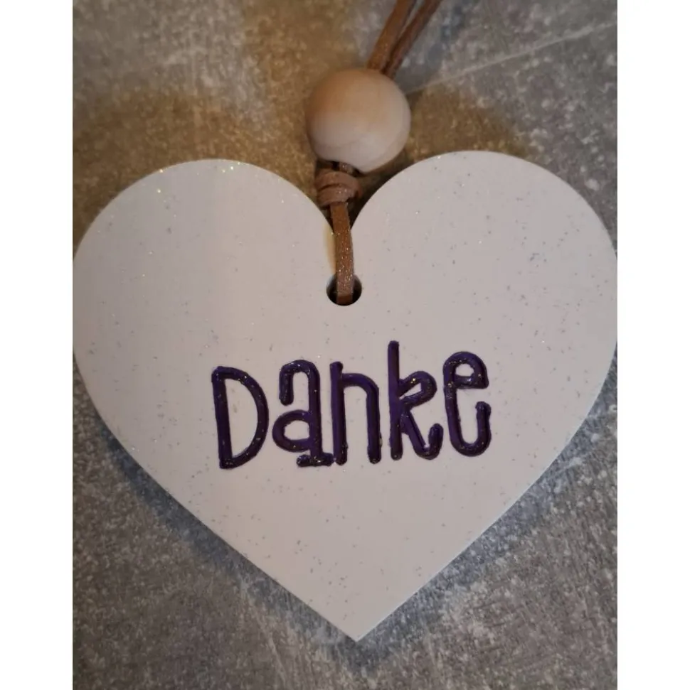 Der Herzanhänger ist ca. 8 cm breit, 7 cm hoch und 0,8 cm dick. Er wird aus hochwertigem Raysin 200 gegossen, mit einer Holzperle und einem Glitzerband in Lederoptik kombiniert. Der Schriftzug wird von Hand mit Acrylfarbe gestaltet und das Herz erhält durch Glimmerlack ein einzigartiges Finish.