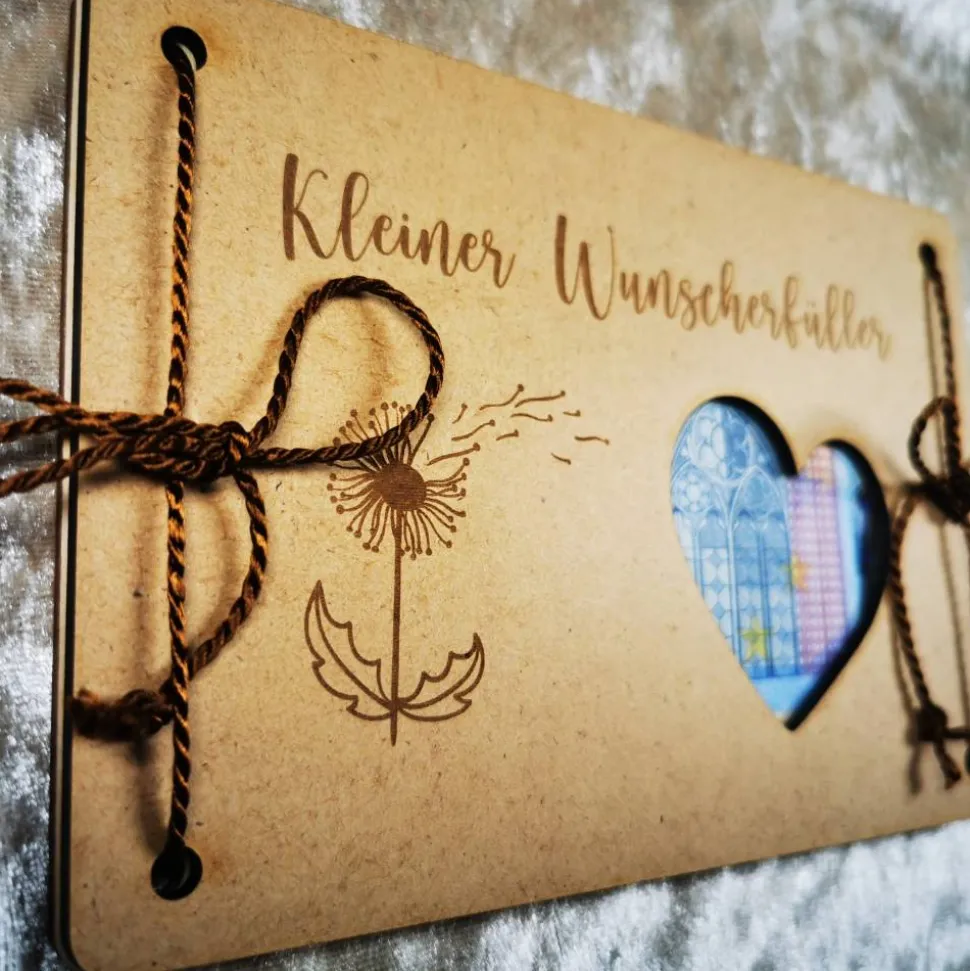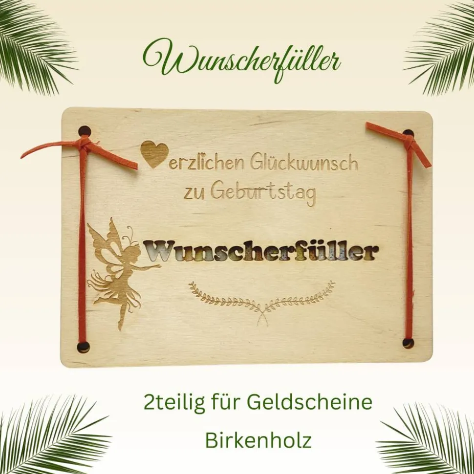 Verschenken Sie Ihre Glückwünsche und Ihr Geldgeschenk mit Stil und Eleganz mit unserer Wunscherfüllerkarte aus Holz. Unsere Geldgeschenkkarte wird mit einem Laser erstellt und per Hand verfeinert. Das abgebildete Geld dient nur zur Veranschaulichung und gehört nicht zum Lieferumfang! Die bei der Lasergravur entstehenden Schmauchspuren und die vom Monitor abweichenden Farbstrukturen können nicht reklamiert werden.