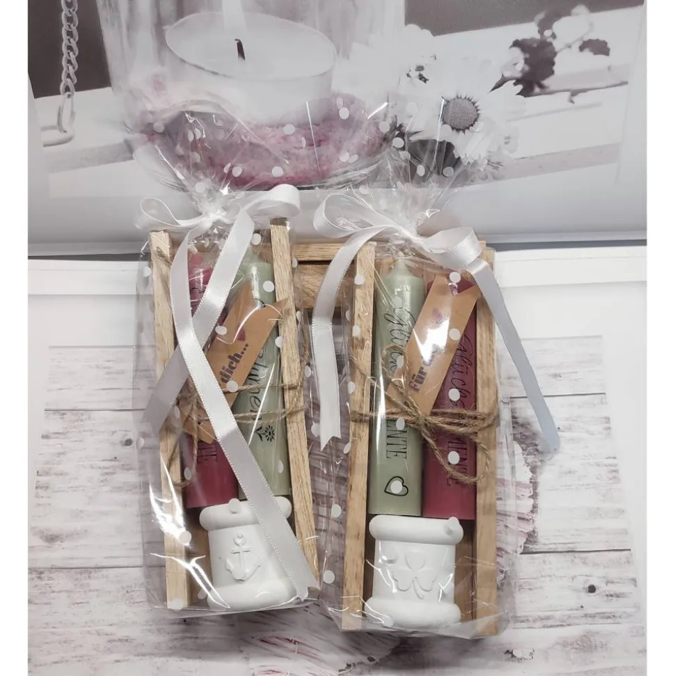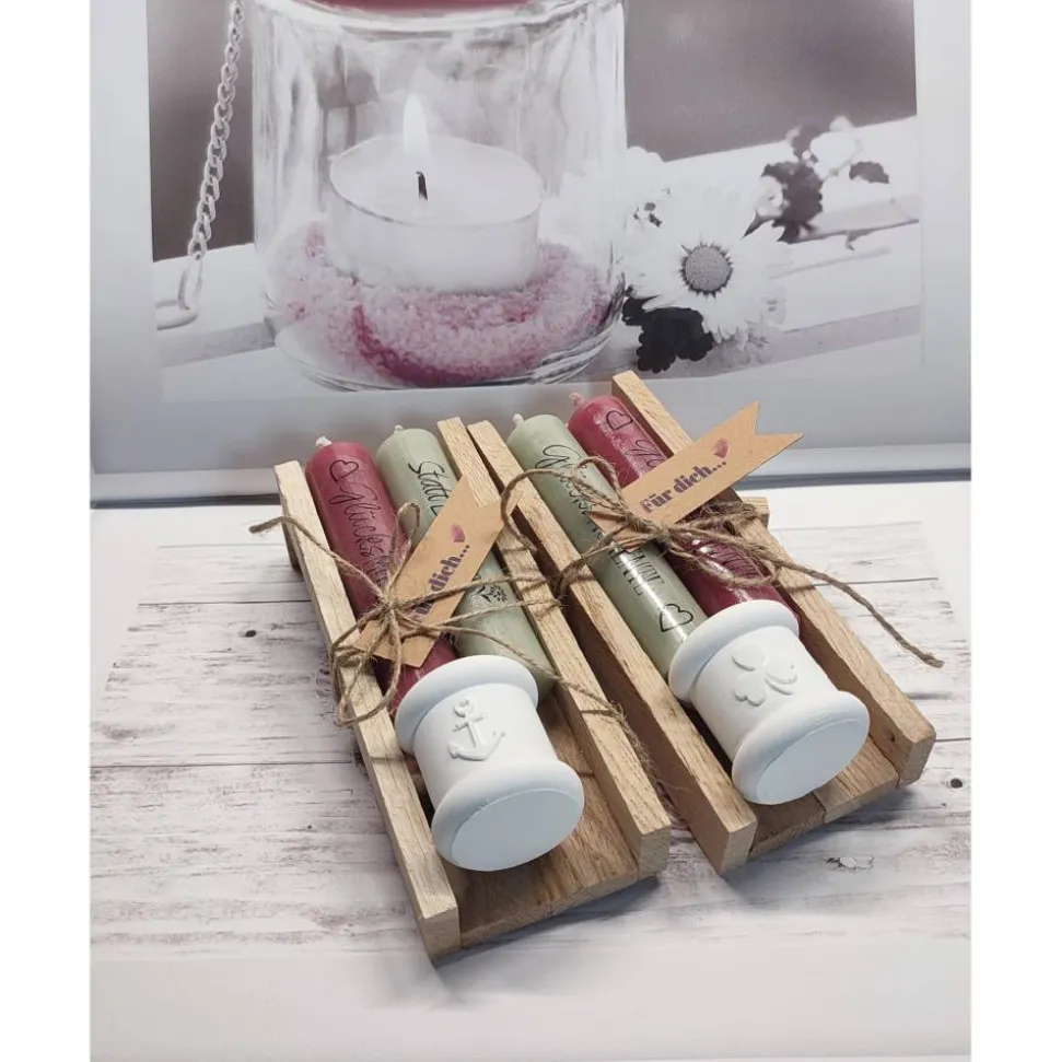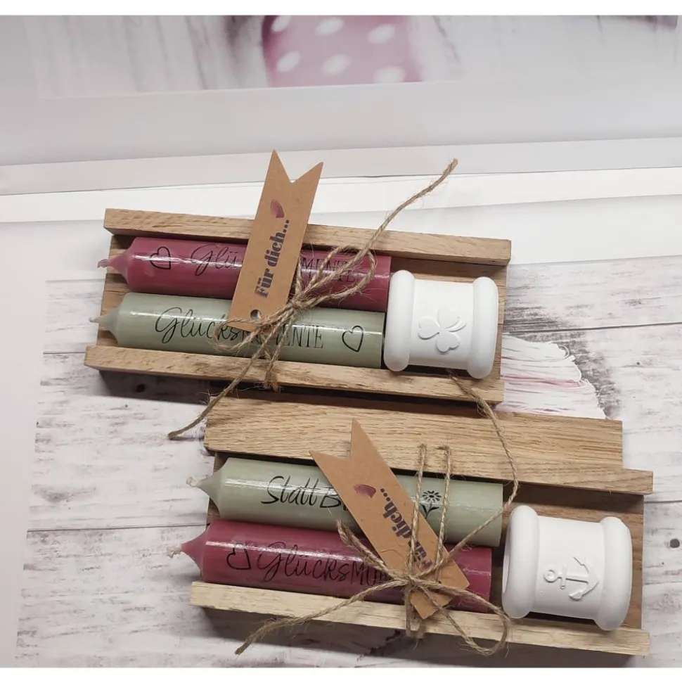 Dieses handverpackte Kerzenset besteht aus zwei Stabkerzen (100/22) mit liebevoller Beschriftung und einem Kerzenhalter – ob schlicht, Kleeblattmotiv oder maritimen Ankermotiv. Perfekt als kleines Geschenk, das von Herzen kommt – für dich oder einen lieben Menschen.