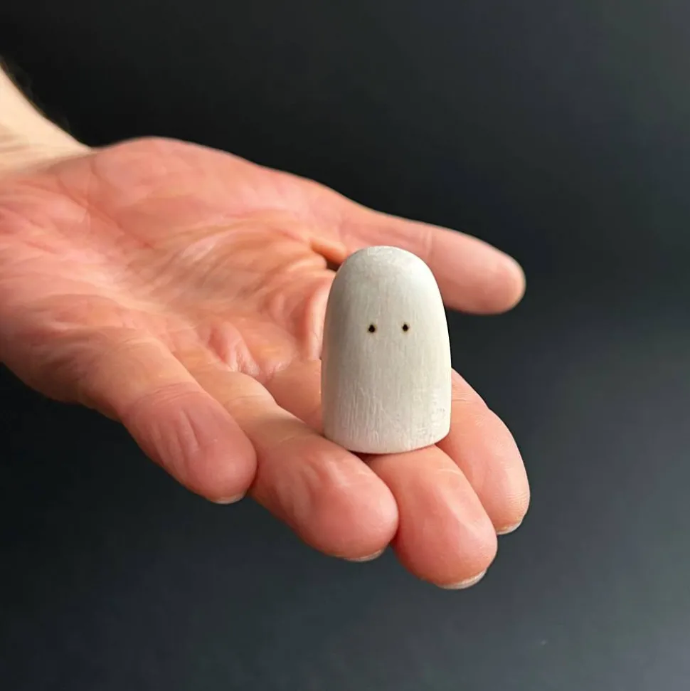 Es ist handgefertigt aus Weißbuchenholz und mit weißpigmentiertem natürlichen Holzöl behandelt. Die Augen wurden ganz am Ende mit einem Brennstab eingebrannt.