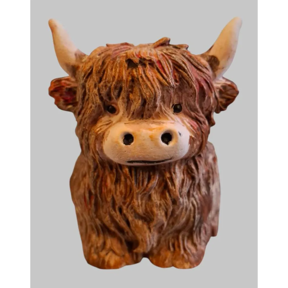 Jedes Hochlandrind wurde von Hand mit Acrylfarbe farblich gestaltet und nicht versiegelt. Nur für den Innenbereich geeignet.