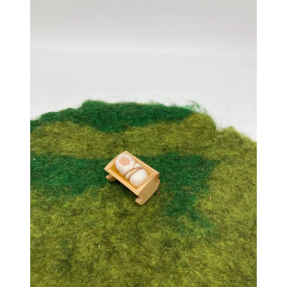 Ein kleines gefilztes Jesuskind in der Holzkrippe. Die Figur ist mit Krippe 4 cm groß und liegt auf einem Bettchen aus gelber Wolle. Die Figur passt wunderbar zu den Figuren vom Jahresring oder einer kleinen gefilzten Krippe.