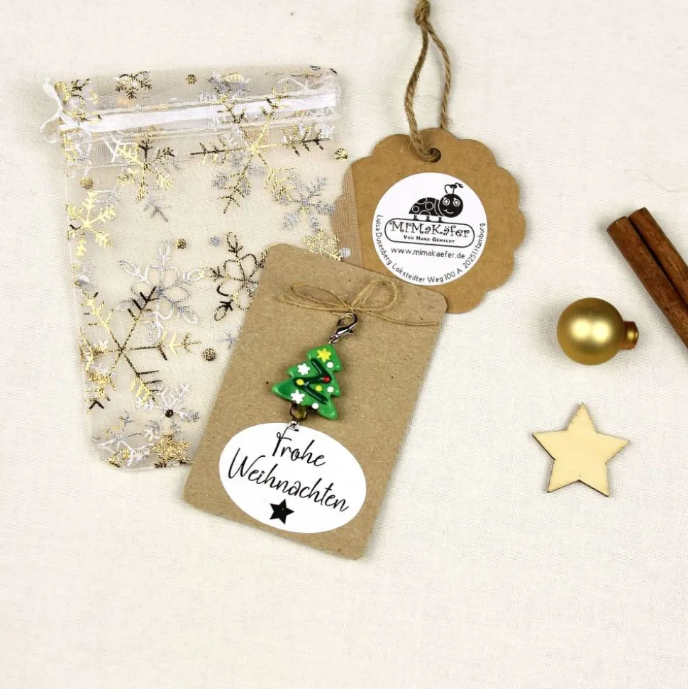 Der Glas-Anhänger ist mit einem Metallkarabiner ausgestattet, sodass du ihn flexibel nutzen kannst: als Charm an Ketten oder Armbändern, an Taschen, Mäppchen oder am Schlüsselbund. Auf der beiliegenden Kraftkarton-Karte kommt der Tannenbaum besonders gut zur Geltung – fertig vorbereitet zum direkten Verschenken.
