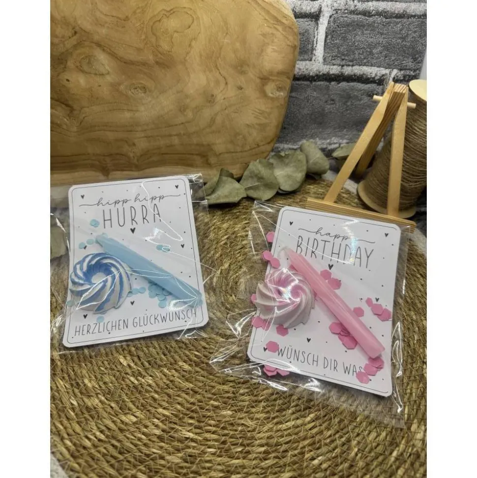 Ihr bekommt eine Geburtstagskarte (hinten beschreibbar), eine Kerze von 10cm x 1,3cm, einen Mini Gugelhupf aus Keracraft und Konfetti in einer Tütte.