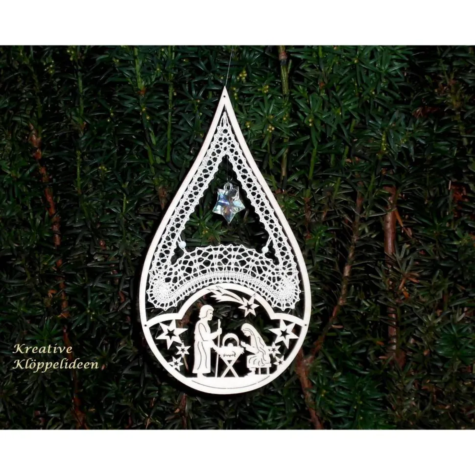 Zum Aufhängen des Klöppelbildes im Fenster ist oben am Tropfen ein dünner Faden angebracht.