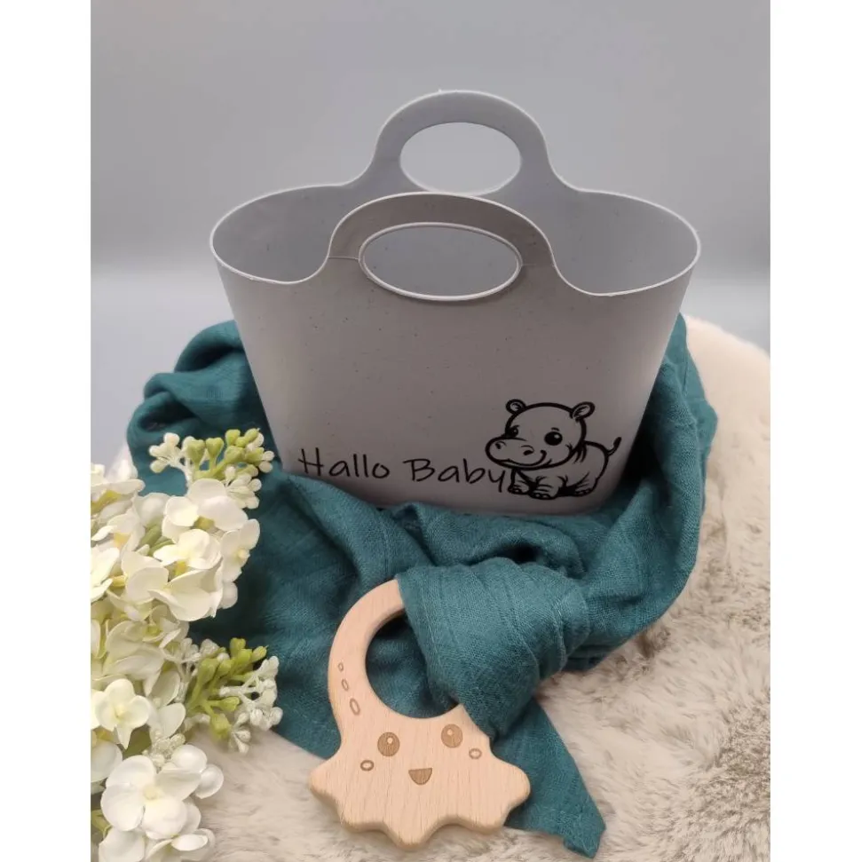 Design: Ovales Körbchen mit niedlichem Nilpferd-Motiv und dem Schriftzug „Hallo Baby“