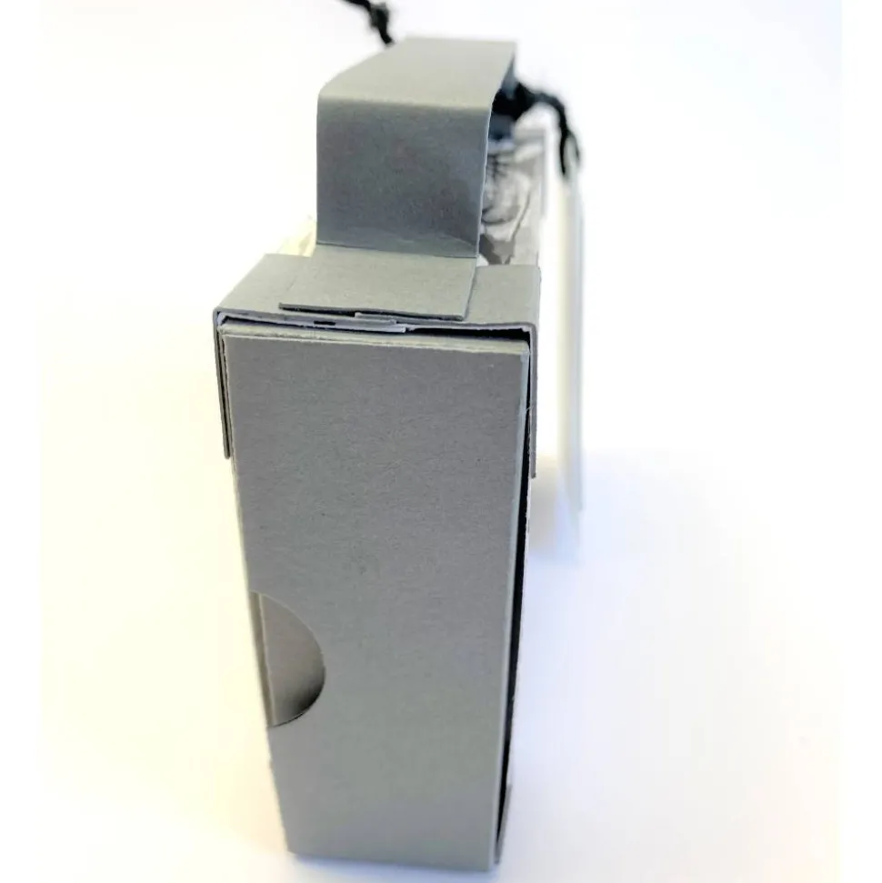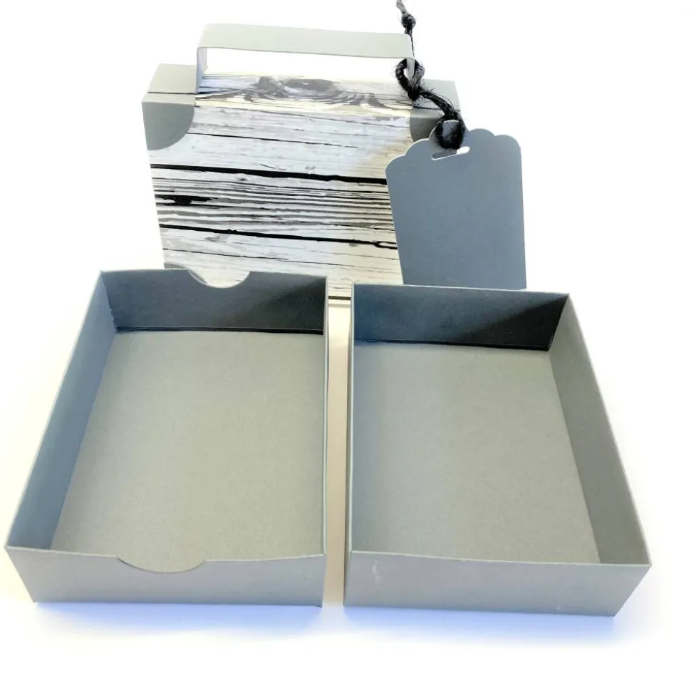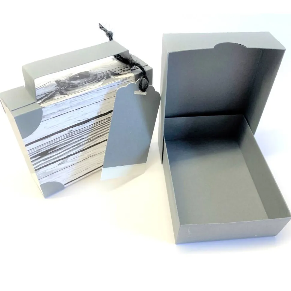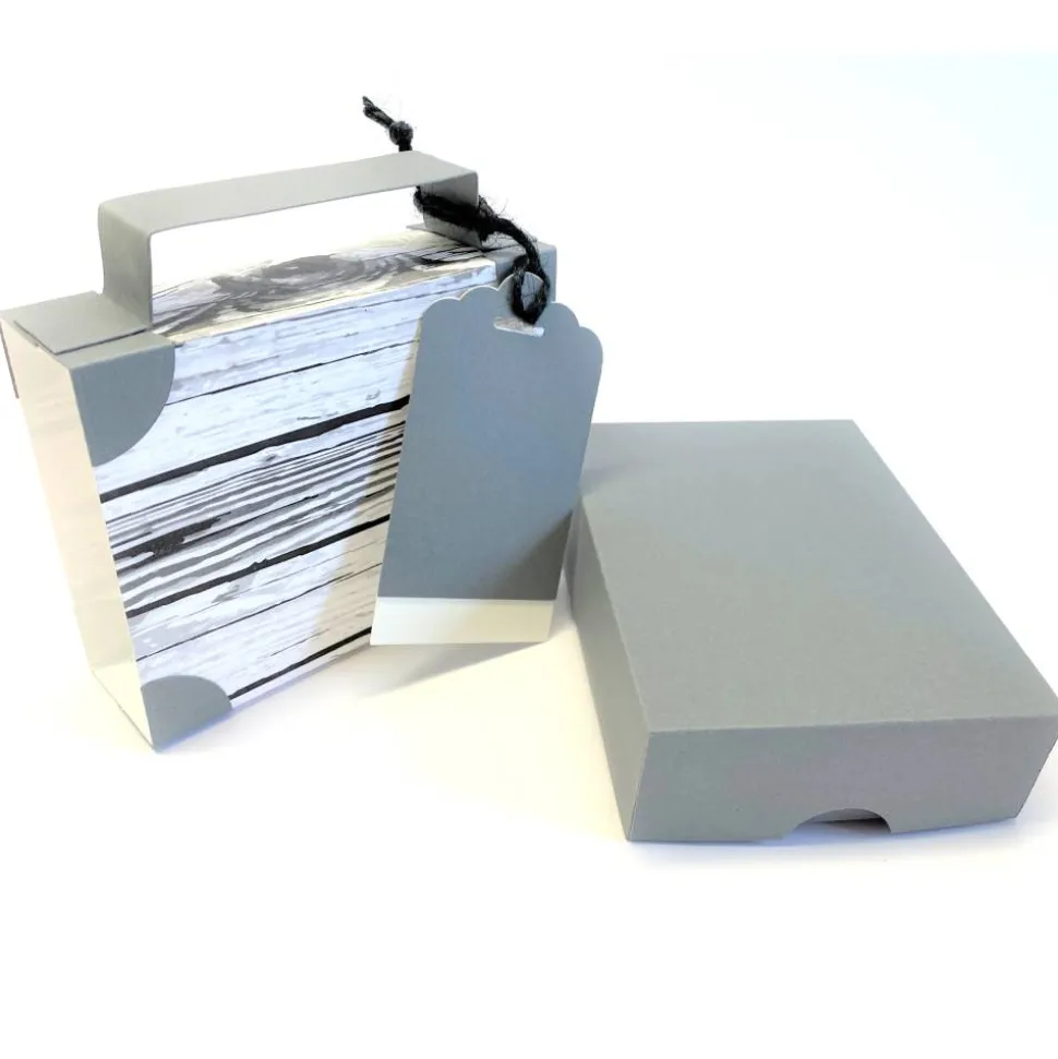 Die innere Schachtel besteht aus Deckel und Boden und kann vom Beschenkten weiterverwendet werden. Zwei unbeschriftete Kofferanhänger bieten Platz für deinen persönlichen Gruß.