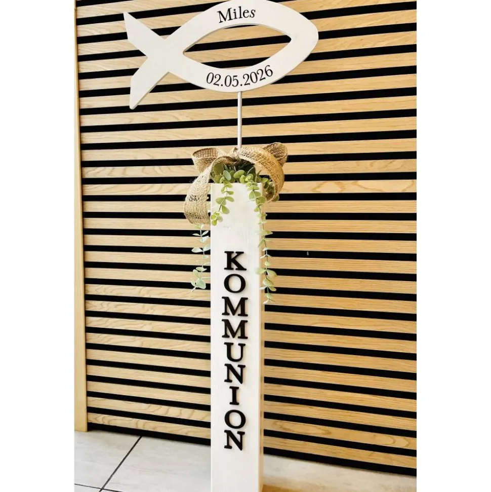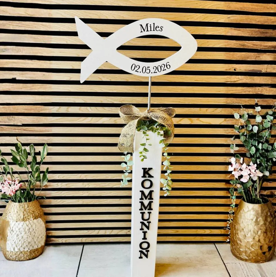 Dieser liebevoll handgefertigte Kommunionsaufsteller mit Fischsymbol ist eine ganz besondere Dekoration für die erste heilige Kommunion und ein wunderschönes Erinnerungsstück.