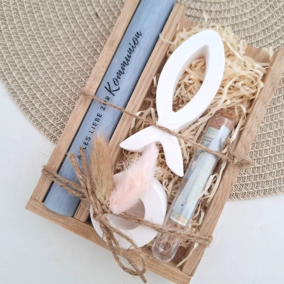 Ergänzt wird das Set mit einem Reagenzglas worin man dem Kommunionskind Geld, Gutscheine oder Ähnliches übergeben kann.