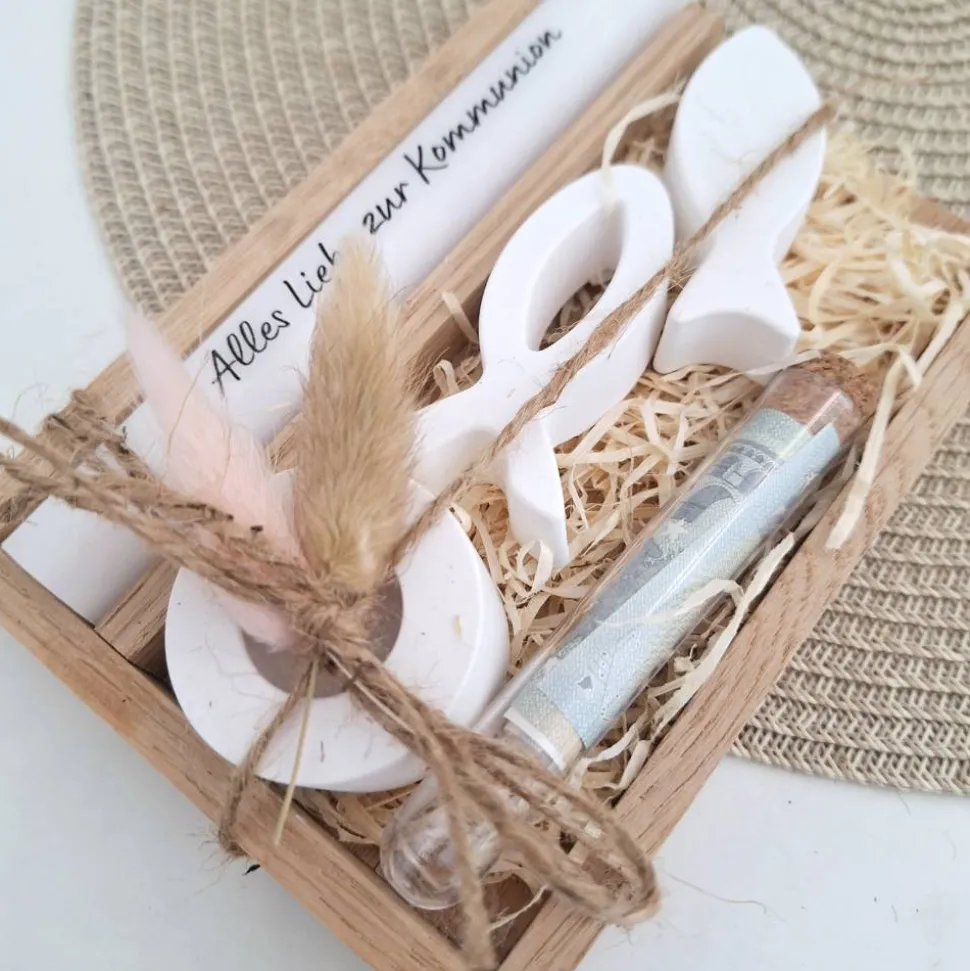 Ergänzt wird das Set mit einem Reagenzglas worin man dem Kommunionskind Geld, Gutscheine oder Ähnliches übergeben kann.