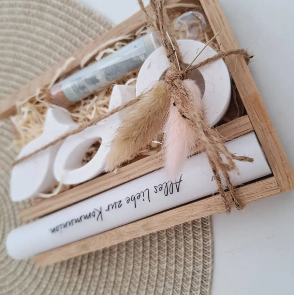 Das Set wird in einem Holzrahmen mit Trockenblumen zusammengebunden und kann so direkt verschenkt werden.