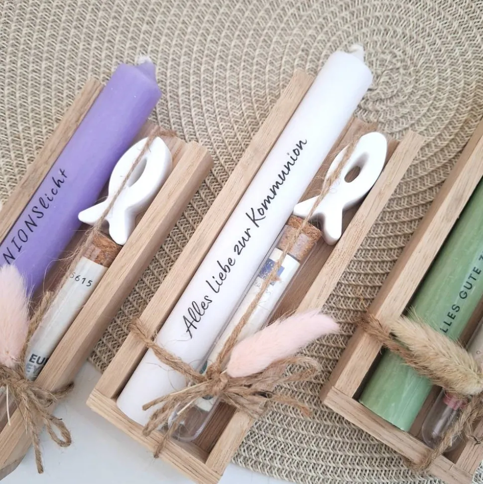 Ergänzt wird das Set mit einem Reagenzglas worin man dem Kommunionskind Geld, Gutscheine oder Ähnliches übergeben kann.