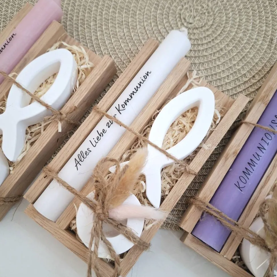 Das Kerzenset besteht aus einer Kerze (in der Farbe deiner Wahl) mit einer Aufschrift deiner Wahl, einem passenden Kerzenhalter in runder Form und einem Fisch (Variante 1).