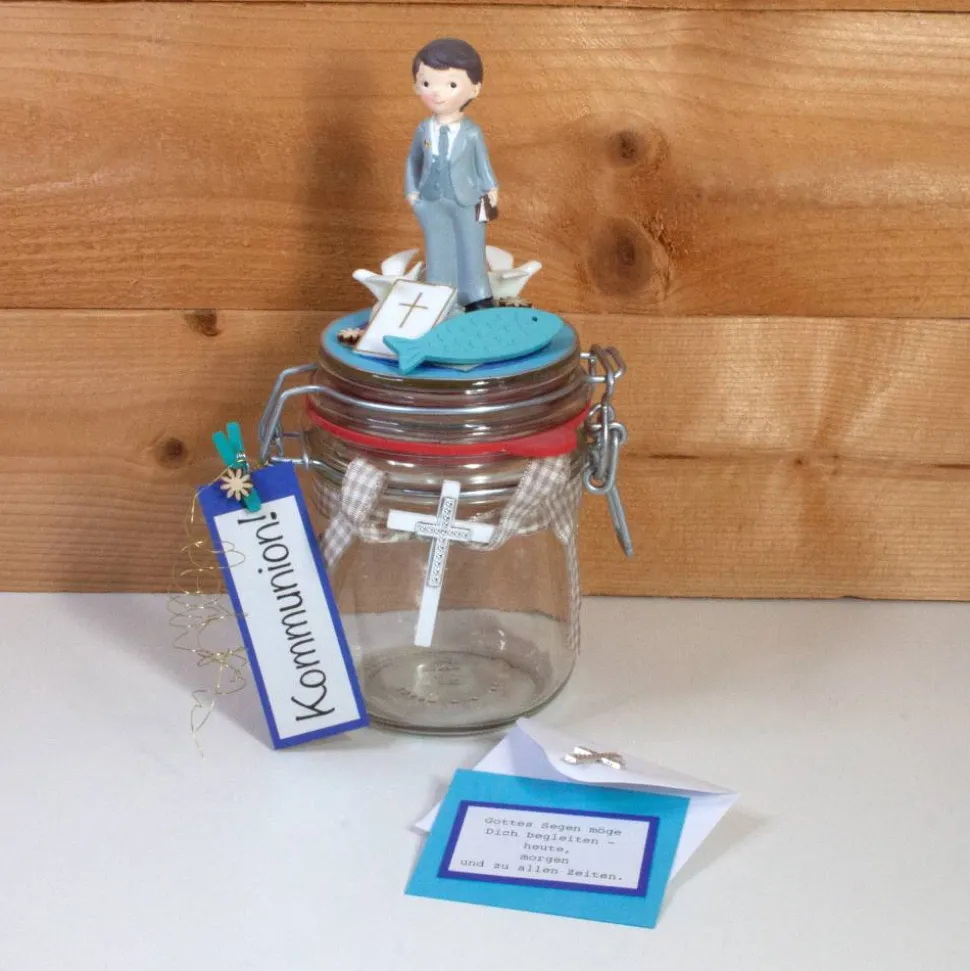 Mit Liebe gestaltetes Geschenkglas für Geldgeschenke und Gutscheine zum Thema Kommunion, Firmung oder Konfirmation ein ausgefallenes Geschenk!