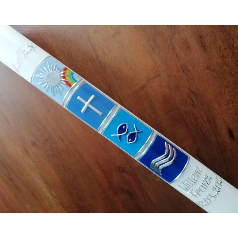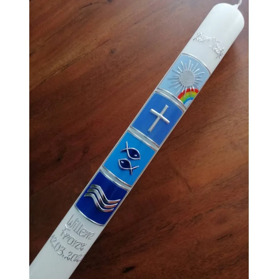 Die Taufkerze kann Ihren Wünschen entsprechend beschriftet werden.