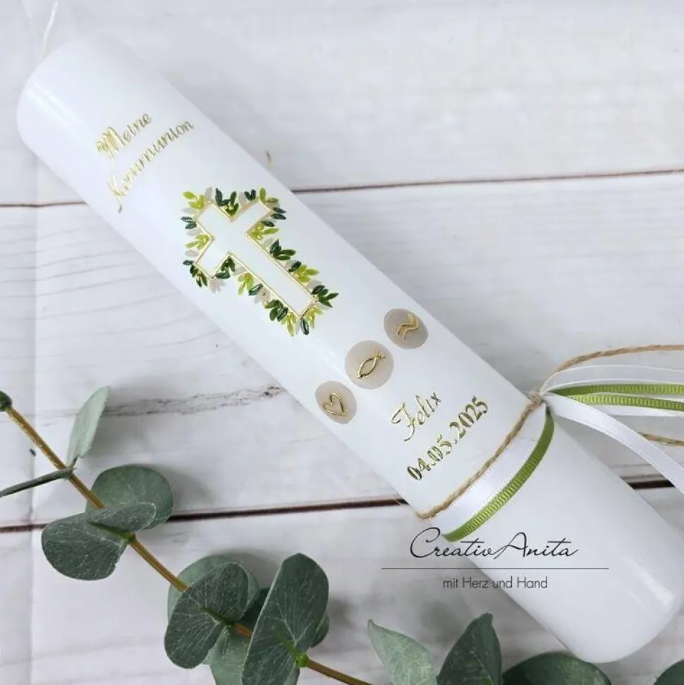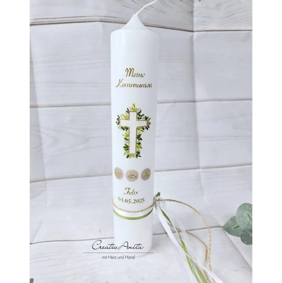 Die Schriftzüge „Meine Kommunion“, Name und Datum werden mit Vinylschrift in gold aufgebracht.