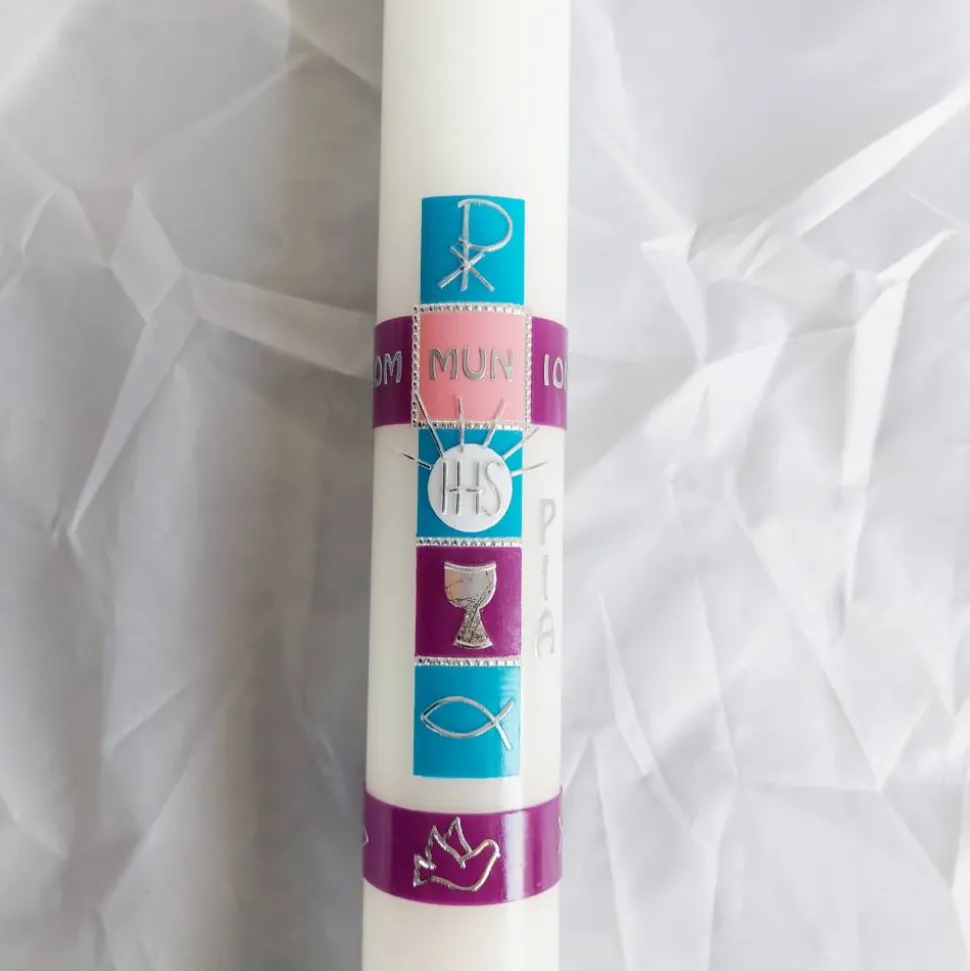 Die Kommunionkerze können wir auf Wunsch auch in anderen Farben gestalten.
