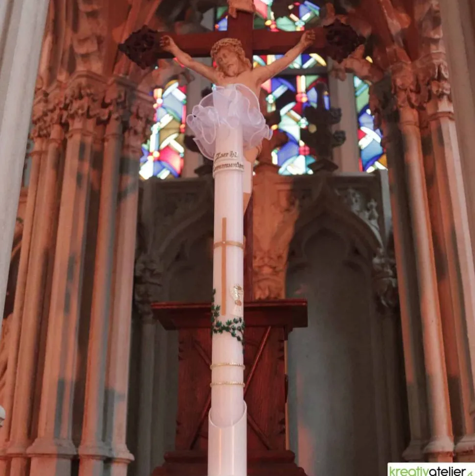 Diese weiße Kommunionkerze mit goldenem Kreuz, Efeuranke und weißem Kelch ist ein würdevolles Symbol für die Kommunion. Das goldene Kreuz steht für den Glauben an Jesus Christus und seine Auferstehung, die Efeuranke für die Verbundenheit mit Gott und die Gemeinschaft der Gläubigen und der weiße Kelch für die Eucharistie, das Herzstück der Kommunion.