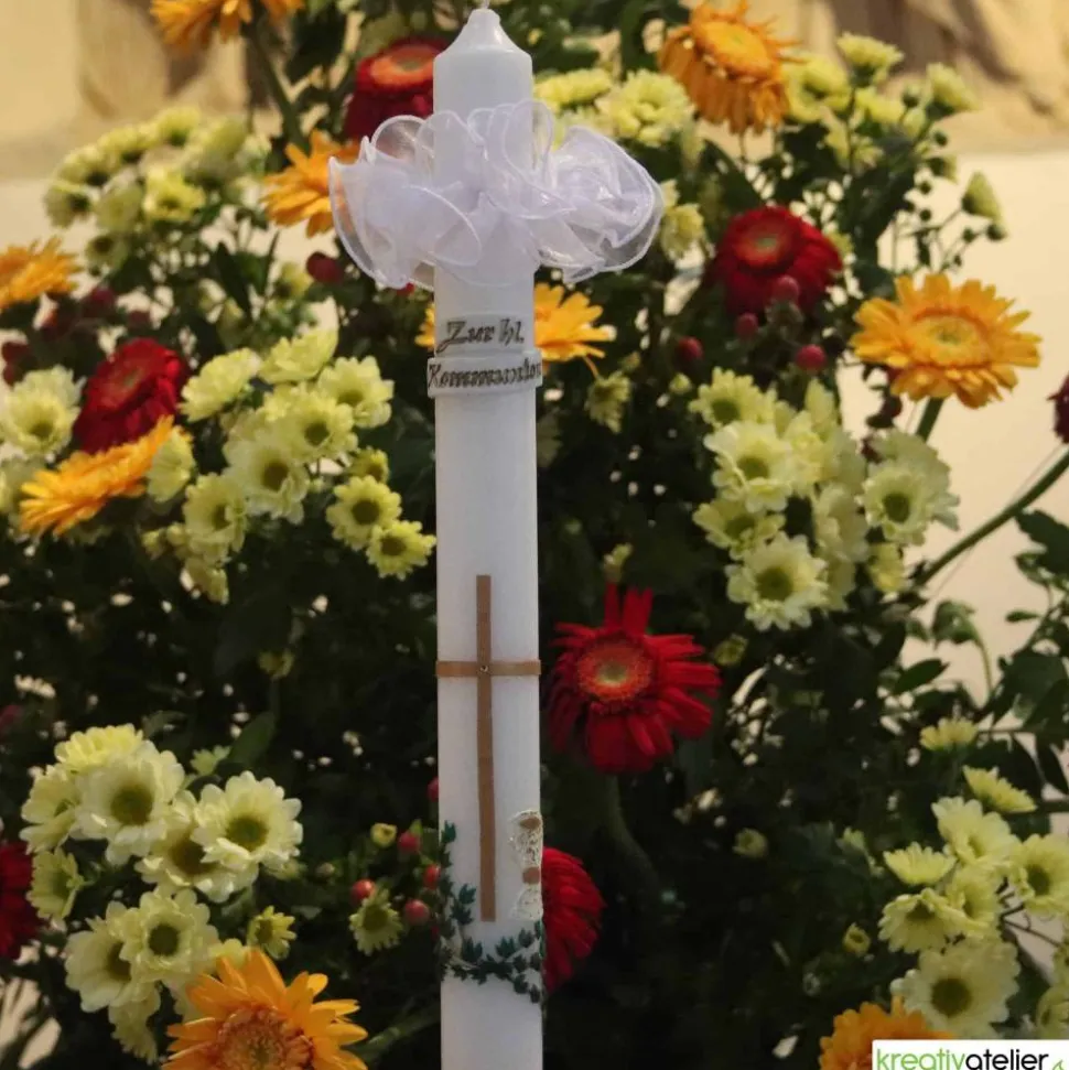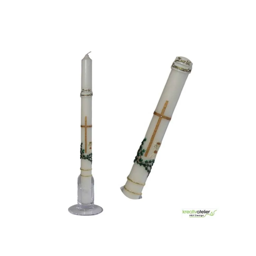 Diese Kommunionkerze wird in meinem Atelier individuell für Sie gefertigt. Als Rohling verwende ich ausschließlich Qualitätskerzen, die in Deutschland nach traditionellen Verfahren gezogen werden.