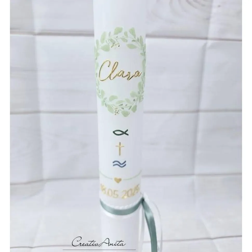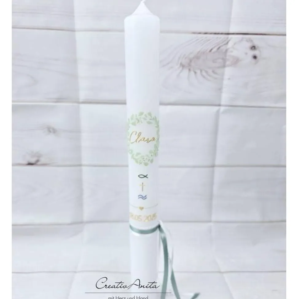 Darunter befinden sich christliche Symbole mit Fisch, Kreuz und Wasser in den Farben grün metallic, gold und blau metallic.