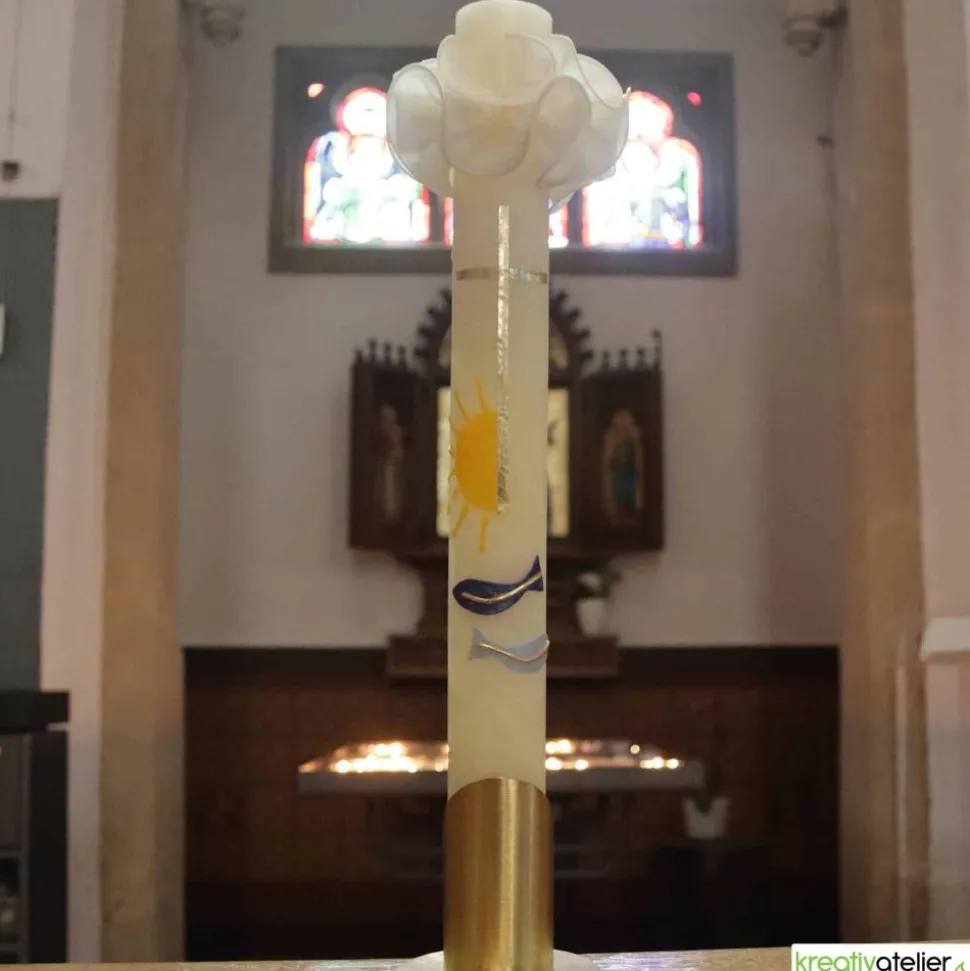 Die Kommunionkerze mit Kreuz, Sonne und Fischen ist ein Symbol für den Empfang der Kommunion und den Glauben an Jesus Christus. Das Kreuz aus edlem Gold steht für das Leiden und den Tod Jesu, während die Sonne aus kräftigem Gelb seine Auferstehung und sein strahlendes Licht symbolisiert und die Hoffnung auf ein ewiges Leben verkörpert. Die Fische im teilweise kräftigen Blau stehen als Symbol für die frühe Christenheit und die Verkündigung des Evangeliums und runden das Gesamtbild der Kommunionkerze wunderbar ab.