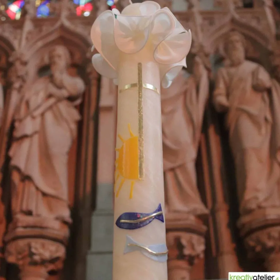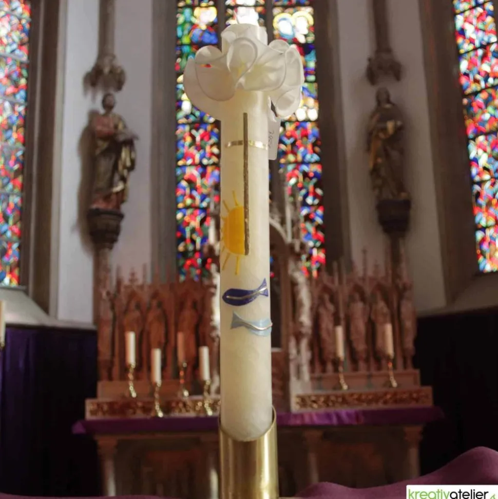 Alle Ornamente werden einzeln von Hand aus verschiedenen Wachsplatten ausgeschnitten, bevor sie kunstvoll auf der Kerze zu einem Gesamtbild arrangiert werden. Die Kommunionkerze kann unterhalb der Fische mit Name und Datum personalisiert werden.