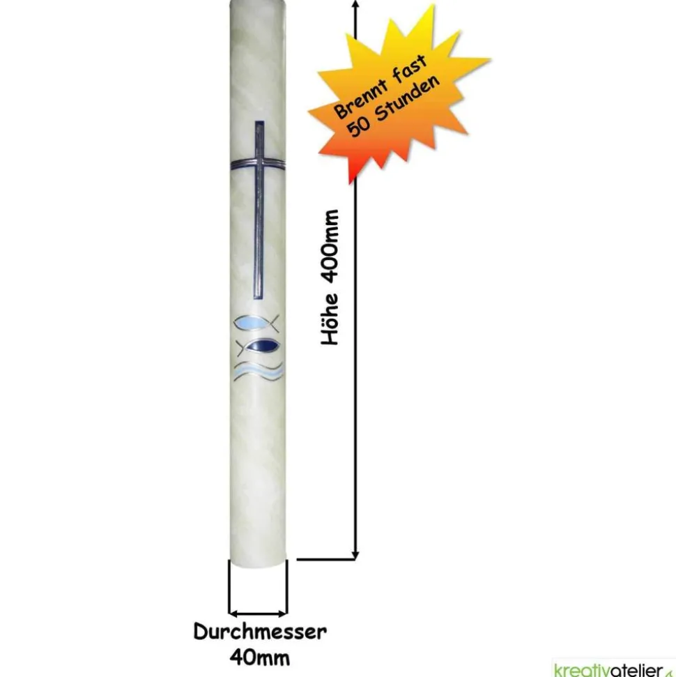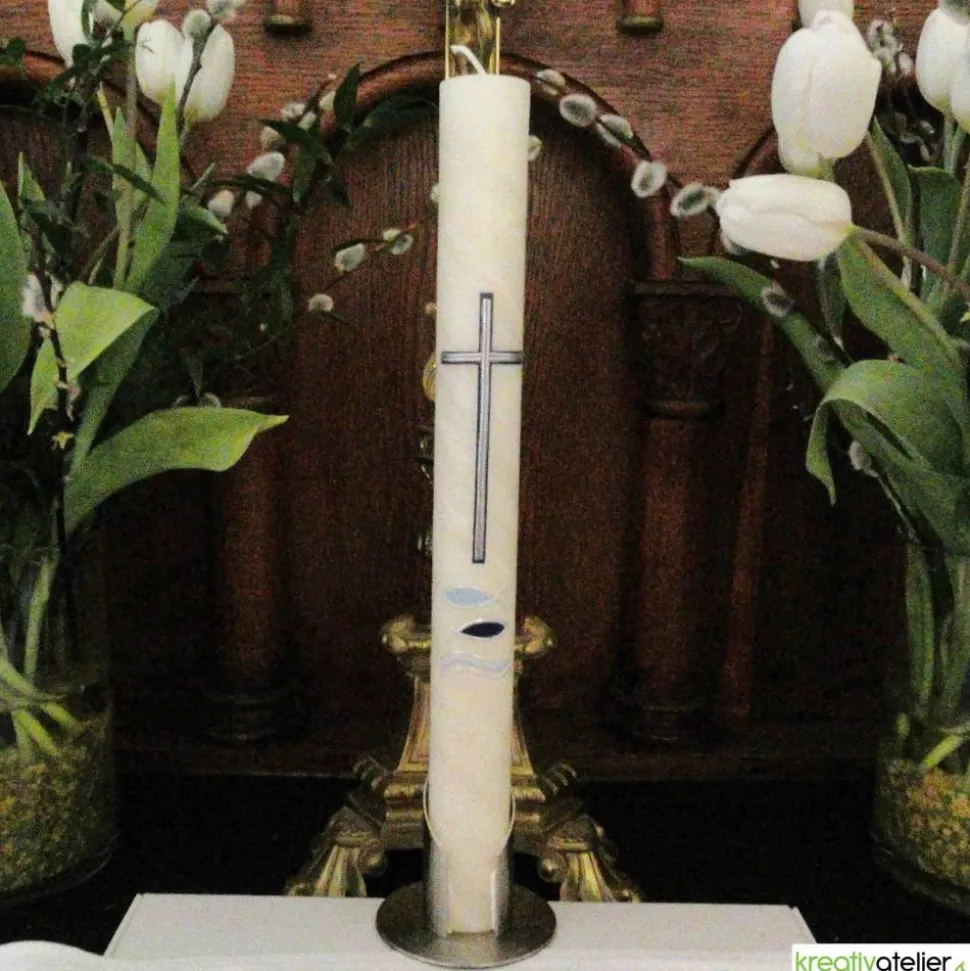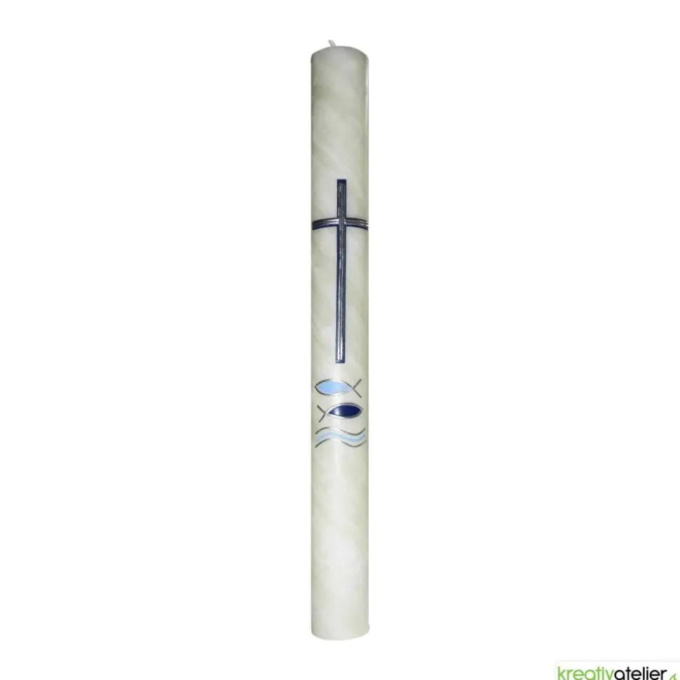 Diese Kommunionkerze aus handgeknetetem Bienenwachs mit blauem Kreuz, Fischen und Wellen ist ein Symbol für die Kommunion und den Glauben an Jesus Christus. Das blaue Kreuz steht für das Leiden und den Tod Jesu, die Fische für die frühe Christenheit und die Verkündigung des Evangeliums und die Wellen für das Meer, das die Welt und die Menschen symbolisiert.