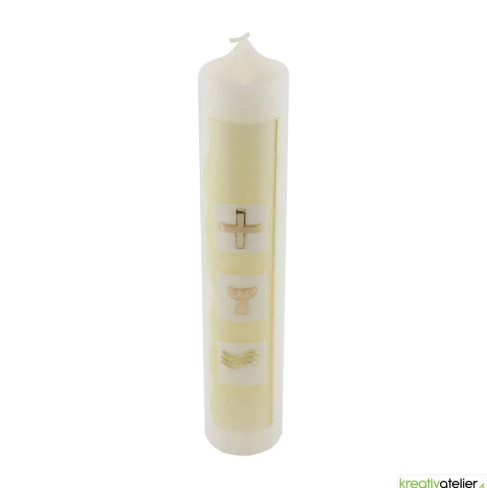 Diese Kommunionkerze wird in meinem Atelier individuell für Sie gefertigt. Als Rohling verwende ich ausschließlich Qualitätskerzen mit RAL-Zertifikat, die in Deutschland nach traditionellen Verfahren gezogen werden.