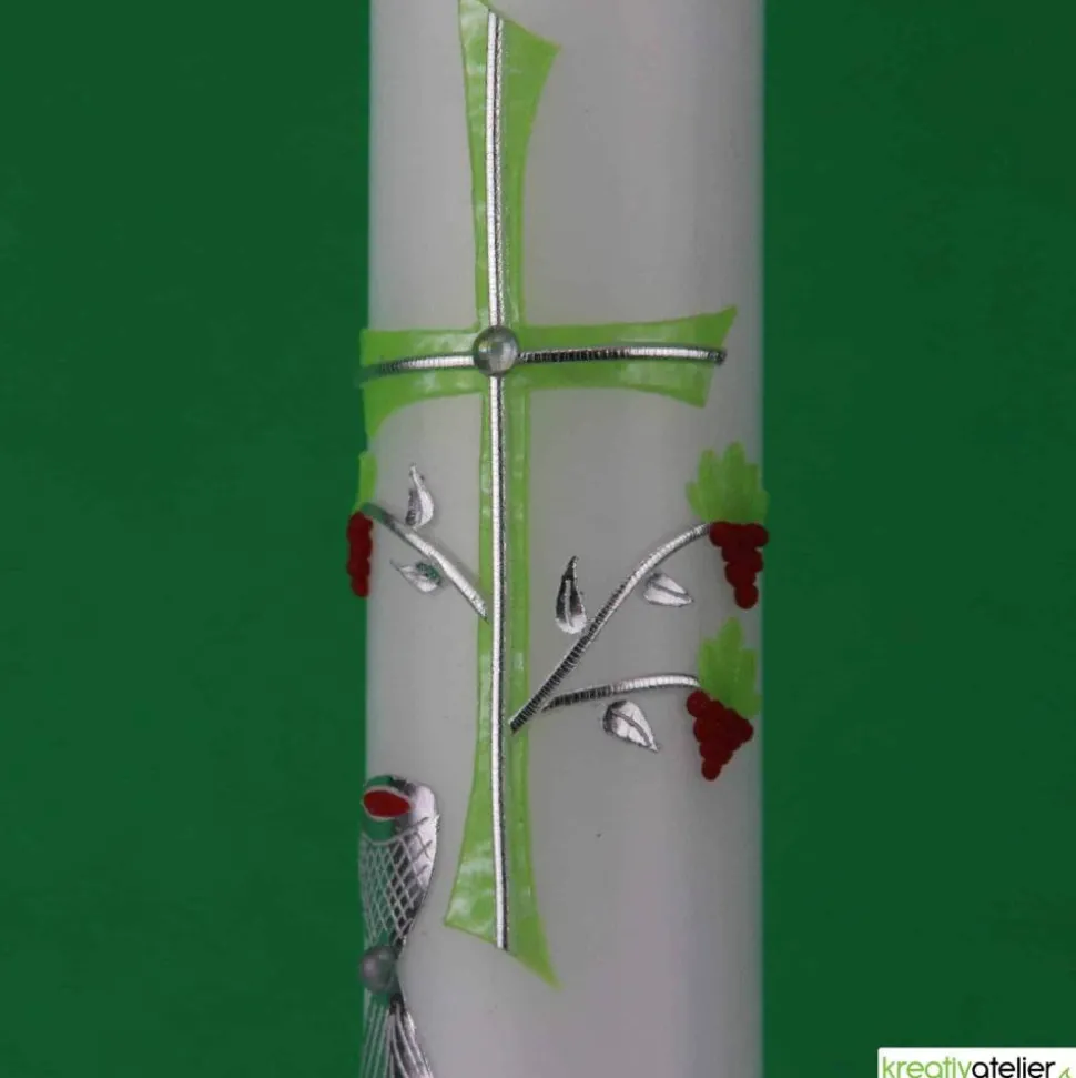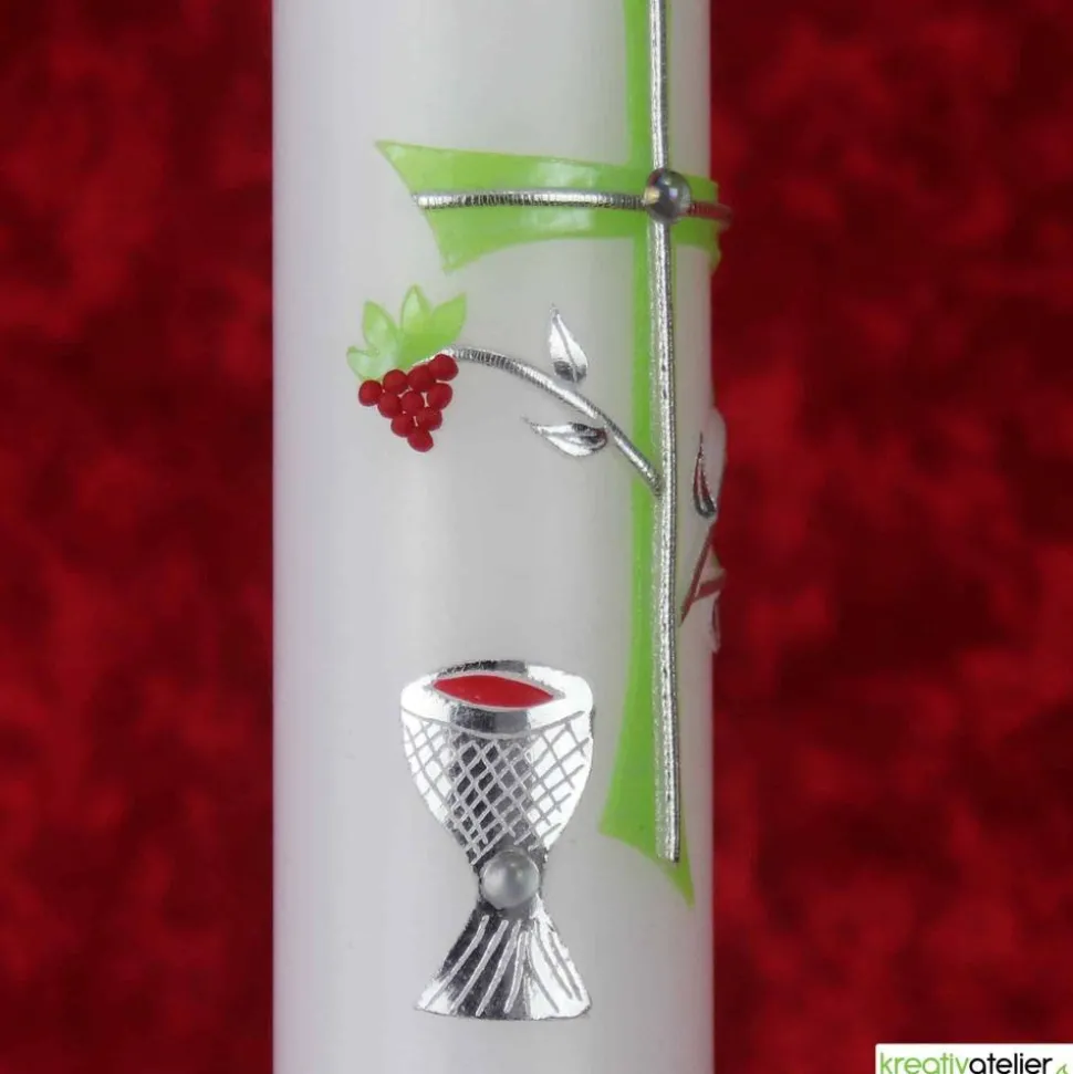 Liebevoll von Hand verzierte, aufwändige Taufkerze mit hellgrünem Byzantiner-Kreuz, silbernem Kelch und einer kleinen Weinrebe. Die Liebe zum Detail wird bei den kleinen, roten Trauben deutlich. Diese bestehen aus feinen Wachskügelchen, die sich sehr schön von der Kerze abheben. Oberhalb des schmalen Bandes kann die Kommunionkerze mit Namen und Daten personalisiert werden.