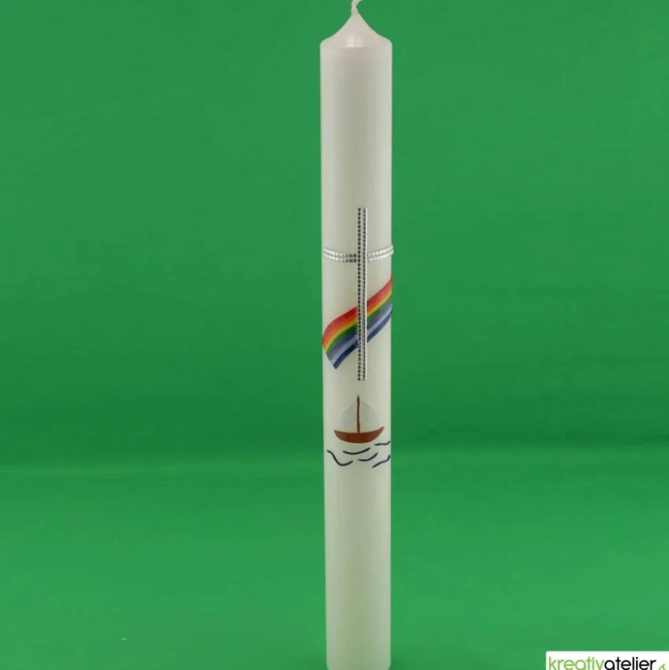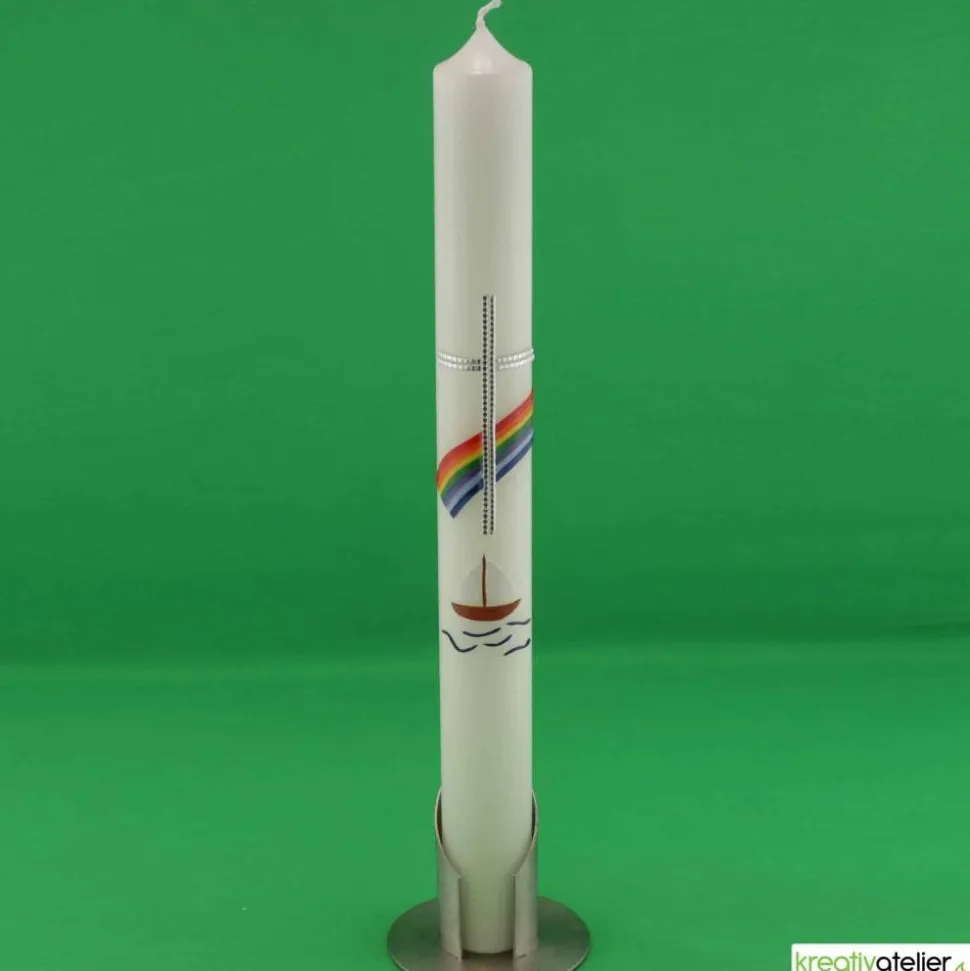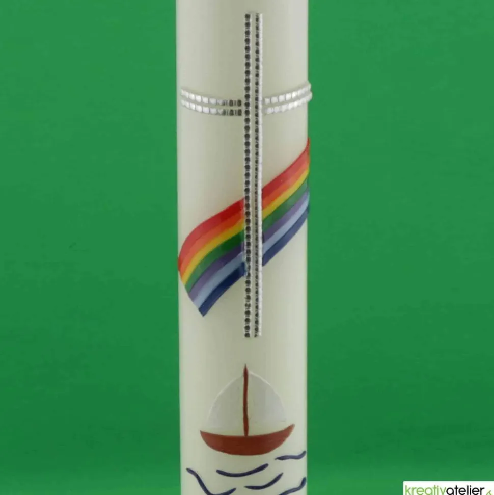 Die wunderschöne Kommunionkerze mit silbernem Kreuz, farbenfrohem Regenbogen, Segelschiff und Meer in elfenbein ist ein Symbol für den Empfang der Kommunion und den Glauben an Jesus Christus. Das Kreuz steht für das Leiden und den Tod Jesu, der Regenbogen für die Verheißung des Friedens und ewigen Lebens, das Segelschiff und das Meer für die Reise des Lebens und den Schutz Gottes.