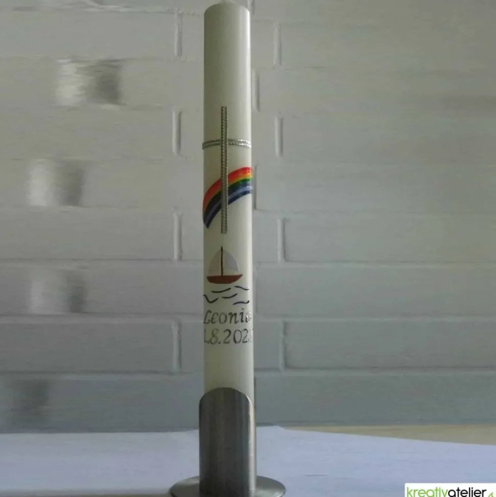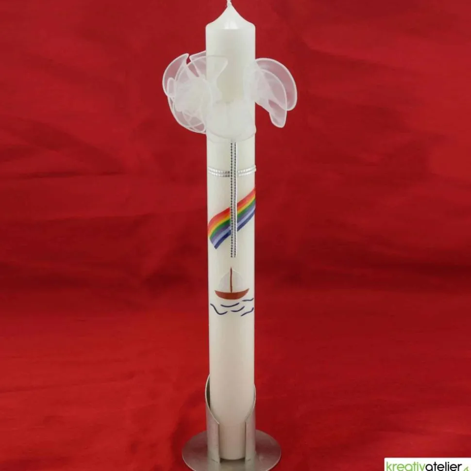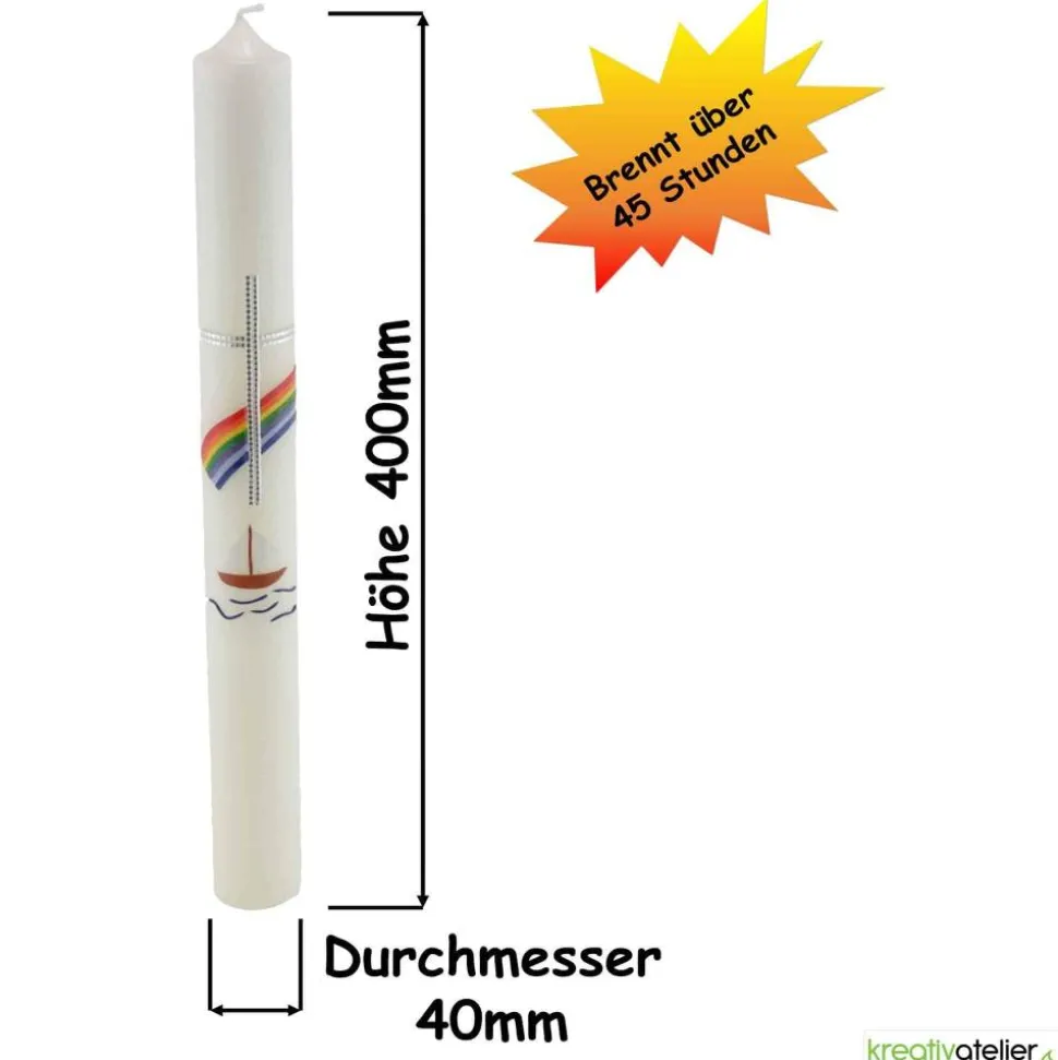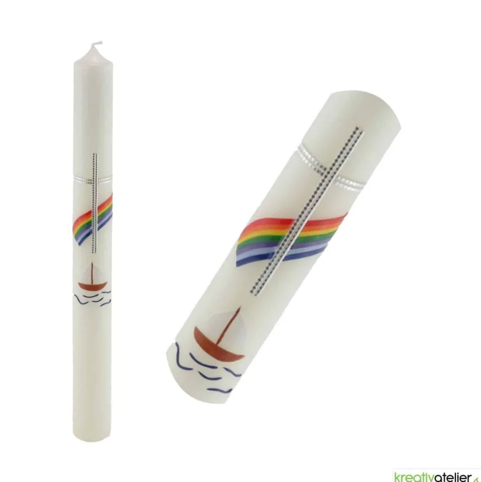 Die wunderschöne Kommunionkerze mit silbernem Kreuz, farbenfrohem Regenbogen, Segelschiff und Meer in elfenbein ist ein Symbol für den Empfang der Kommunion und den Glauben an Jesus Christus. Das Kreuz steht für das Leiden und den Tod Jesu, der Regenbogen für die Verheißung des Friedens und ewigen Lebens, das Segelschiff und das Meer für die Reise des Lebens und den Schutz Gottes.