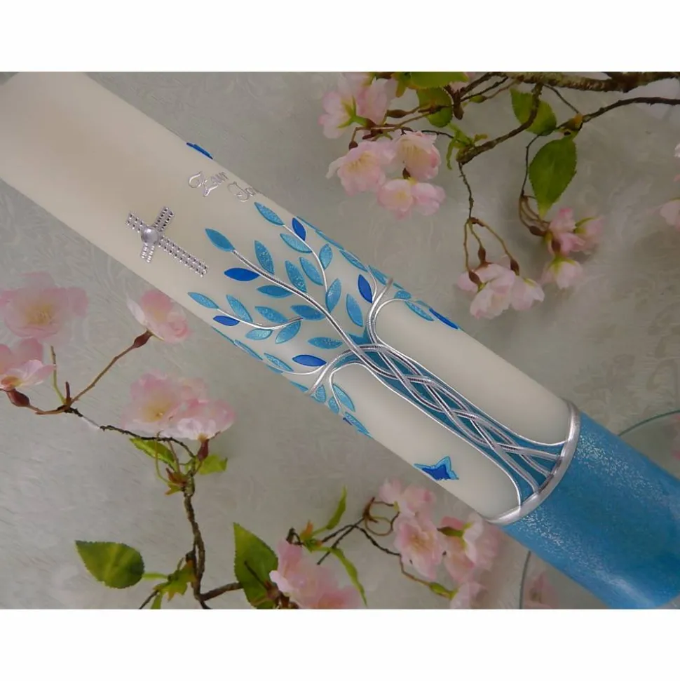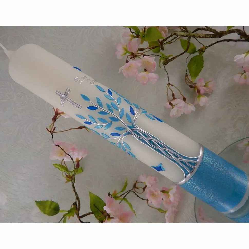Kommunionkerze Taufkerze lang Jungen Lebensbaum blau silber Baum des Lebens Kreuz Schmetterlinge Name Datum individualisierbar 300/50 mm