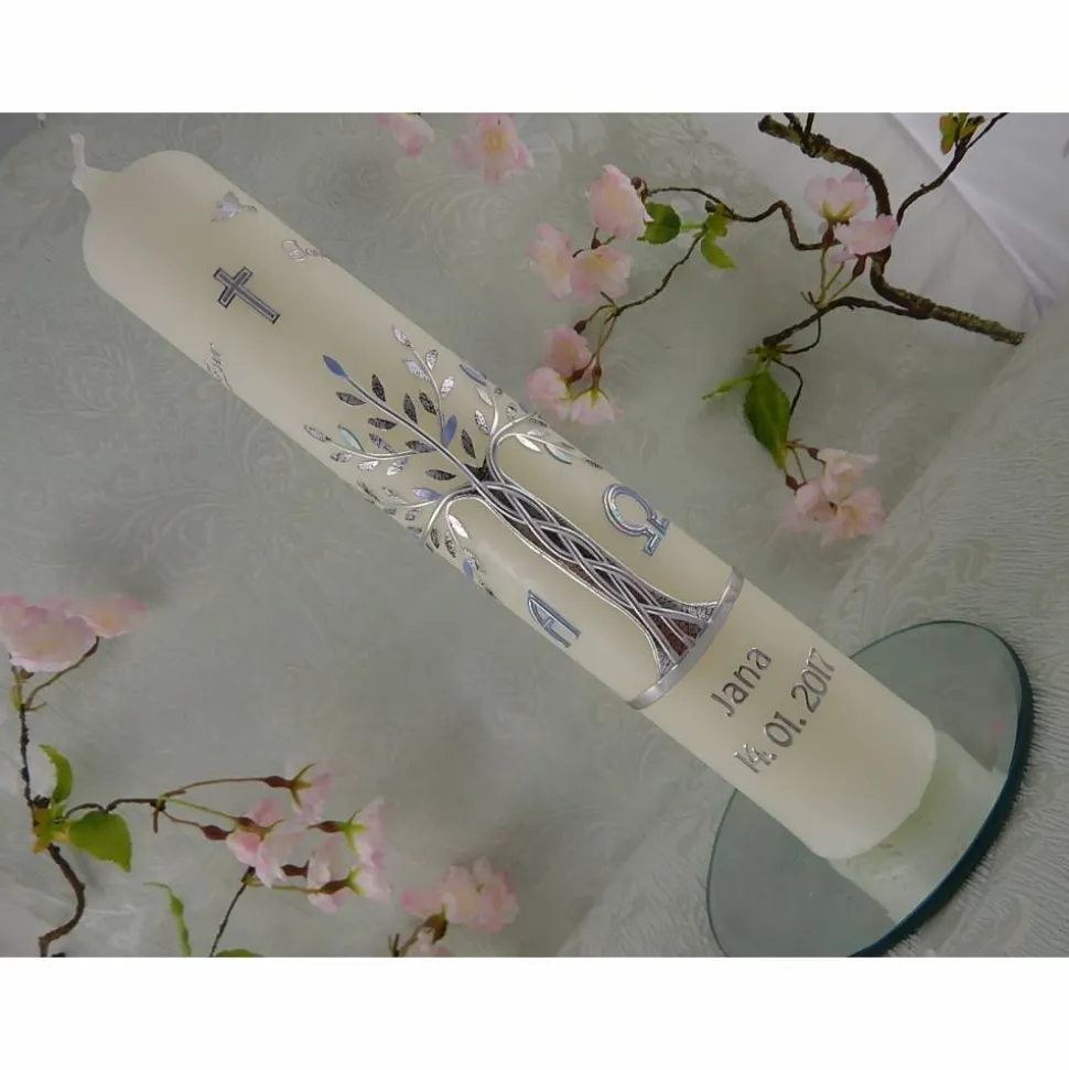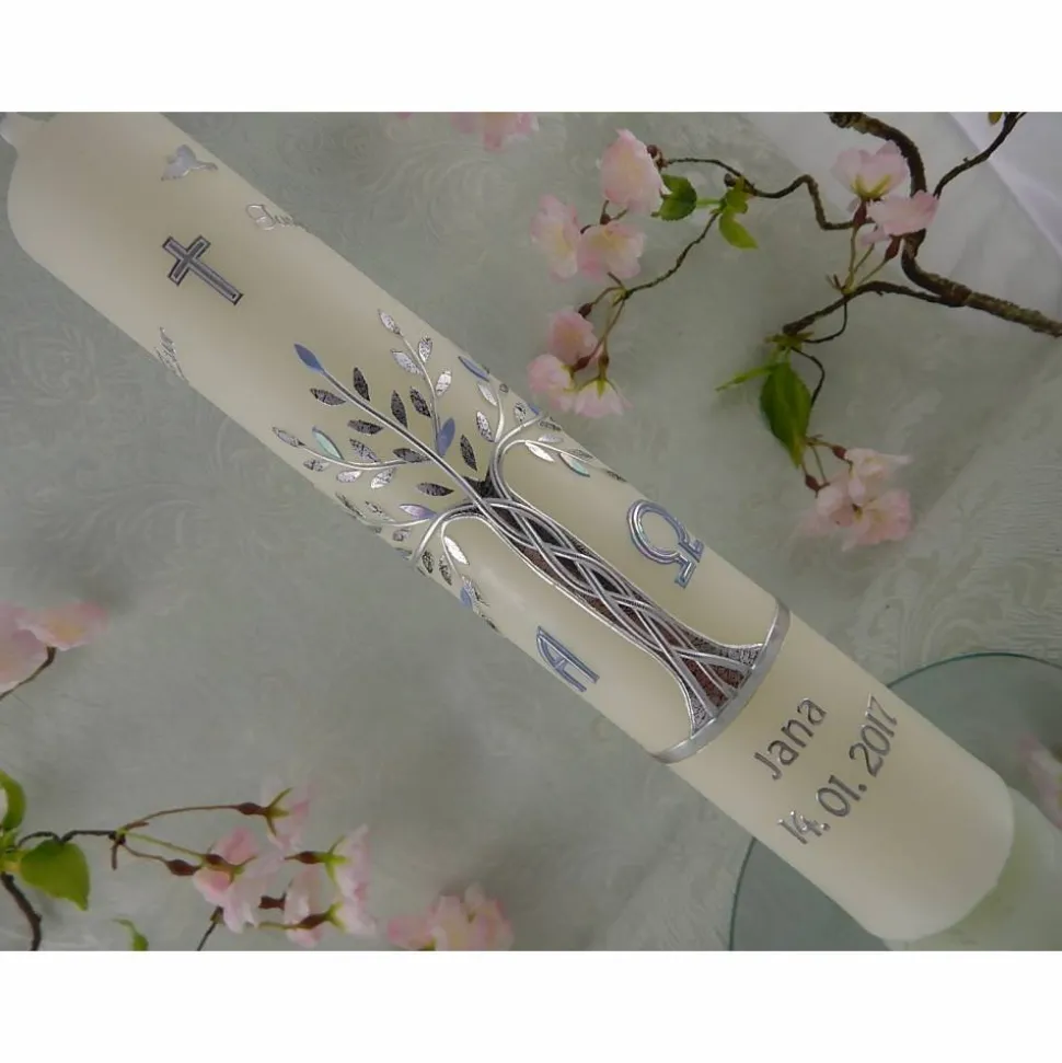 Kommunionkerze Taufkerze lang Jungen Lebensbaum silber Baum des Lebens Kreuz Schmetterlinge Name Datum individualisierbar 300/50 mm