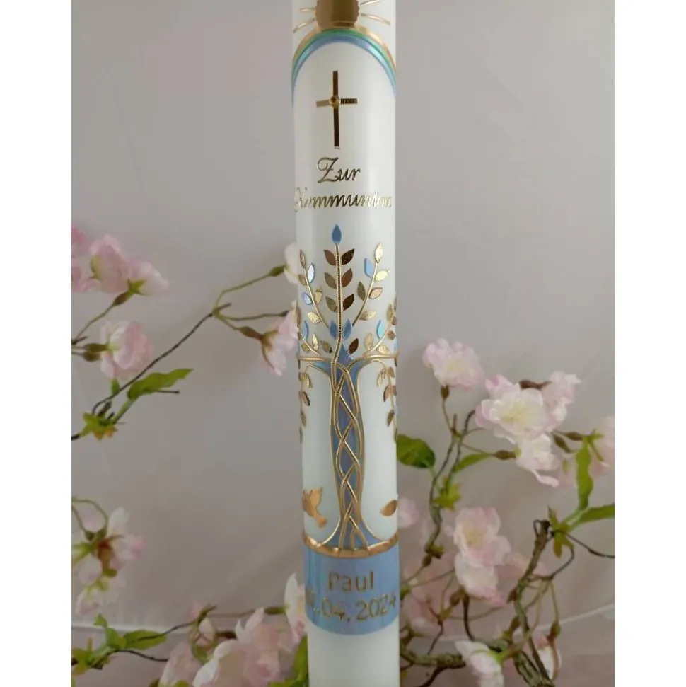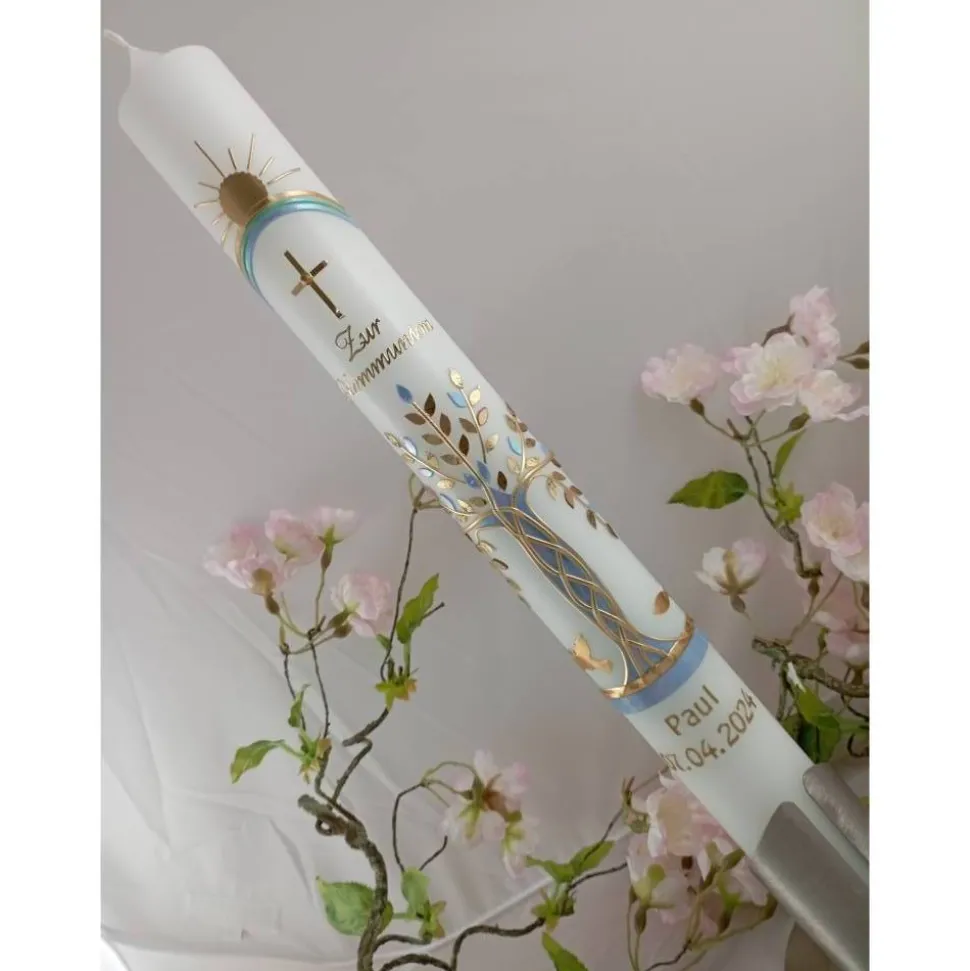 Kommunionkerze Taufkerze lang Lebensbaum Baum Regenbogen Sonne Fische Jungen Name Datum individualisierbar 400/40 mm