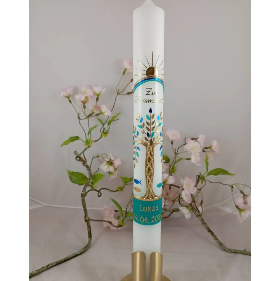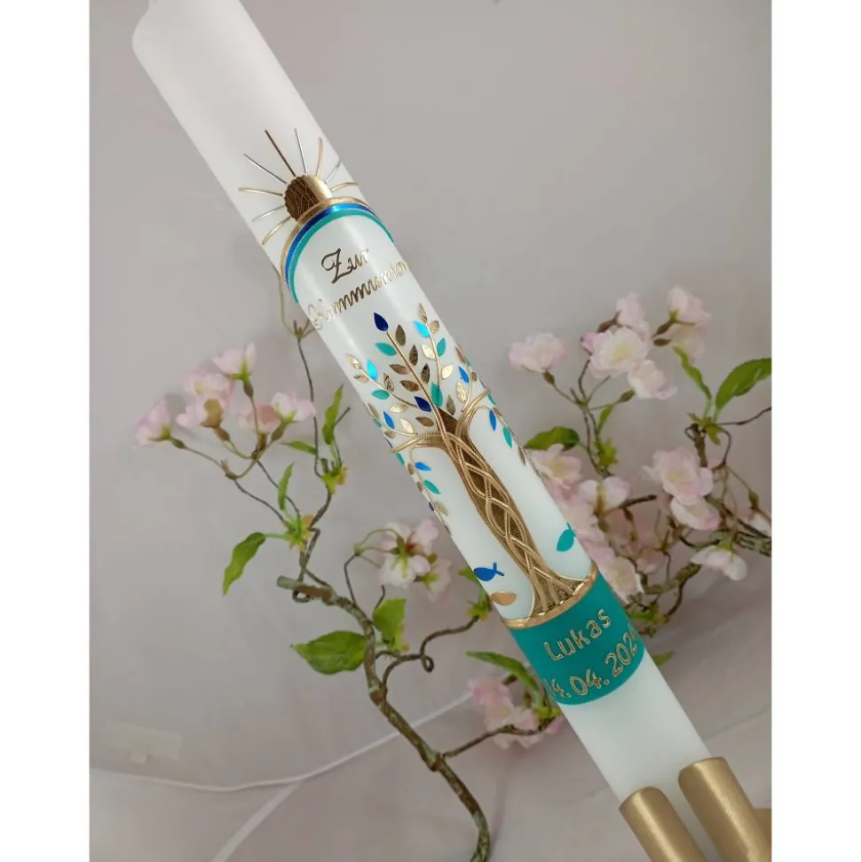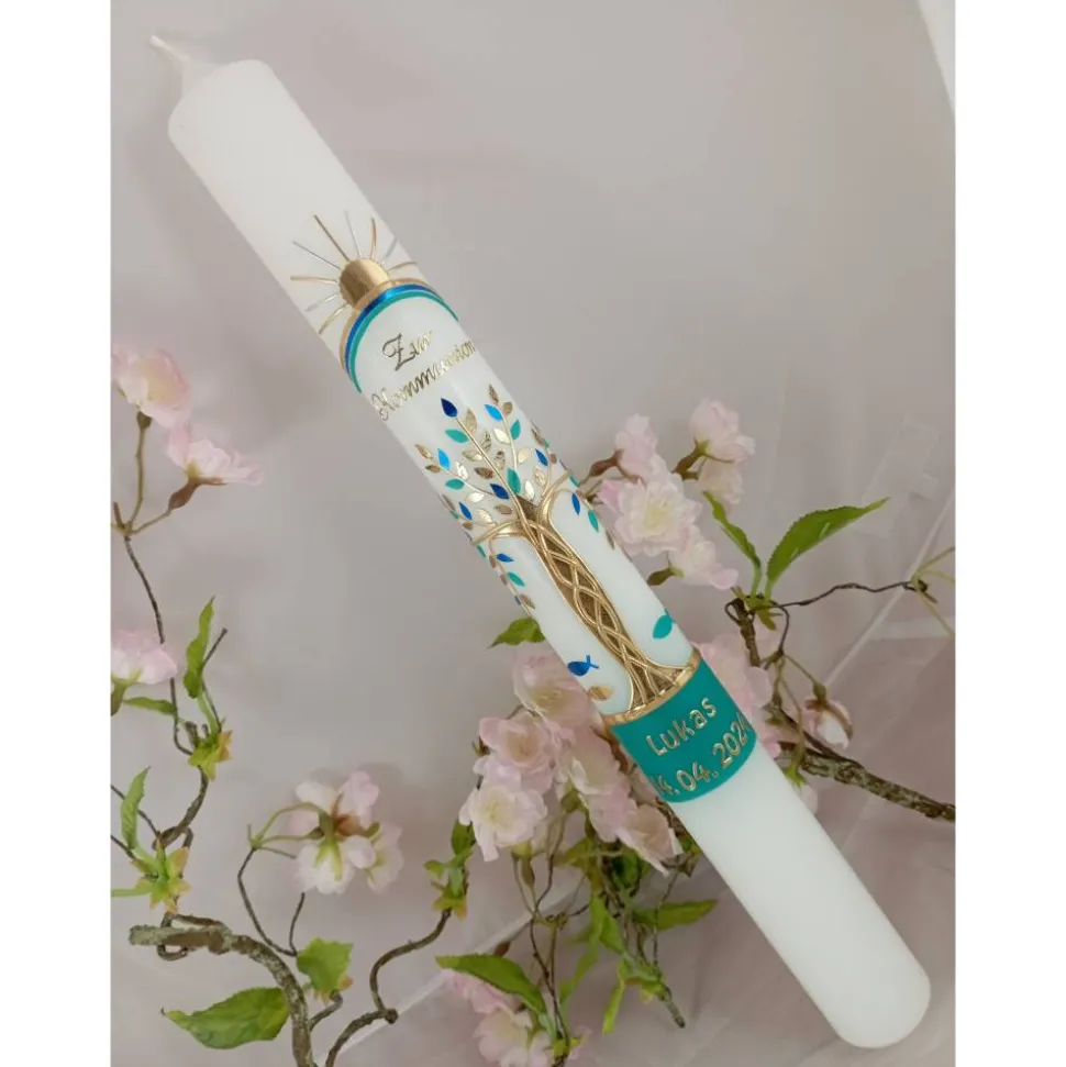 Kommunionkerze Taufkerze lang Lebensbaum Baum Regenbogen Sonne Fische Jungen Name Datum individualisierbar 400/40 mm